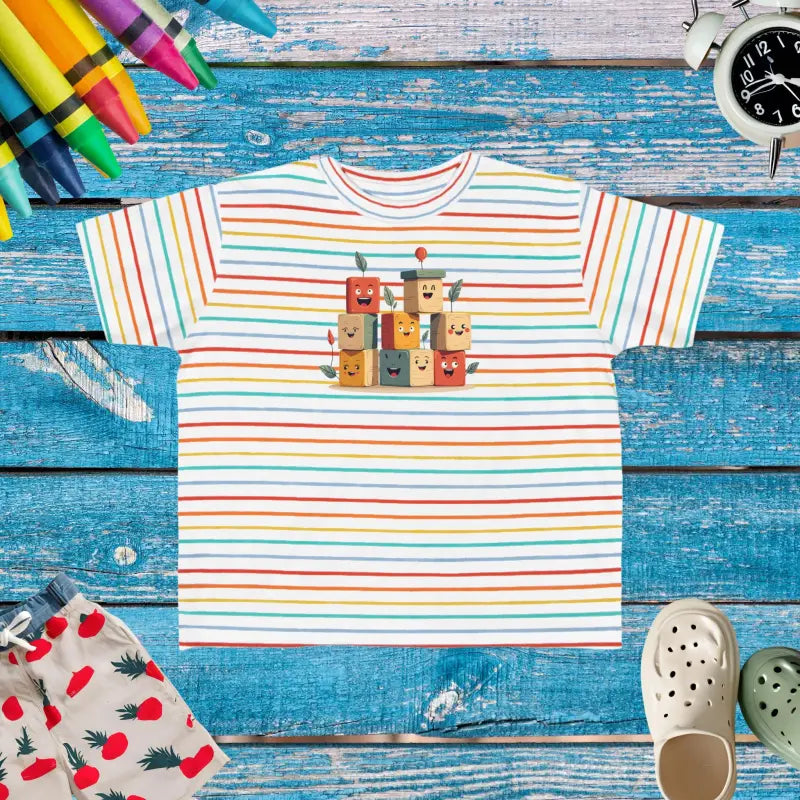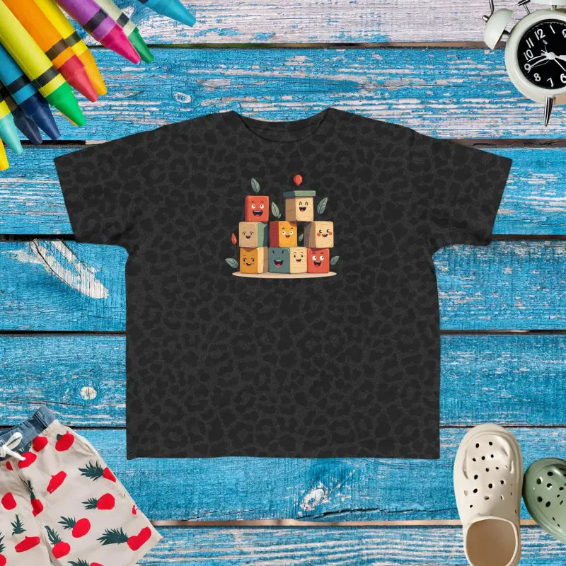 This playful cartoon tee featuring adorable cartoon faces and building blocks is made for active toddlers who love a splash of imagination. Embrace the fun, let your kid rock the playful cartoon style, and add this must-have tee to your cart today!