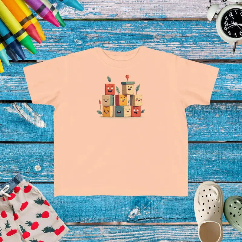 Get ready for an explosion of cuteness and fun that turns every playdate into a style statement! This tee solves the problem of boring outfits by adding a zesty mix of playful cartoon faces and vibrant building blocks that spark creativity in your little one's wardrobe.