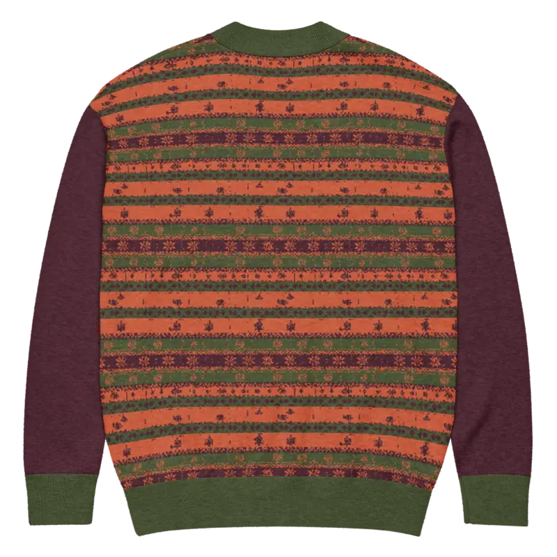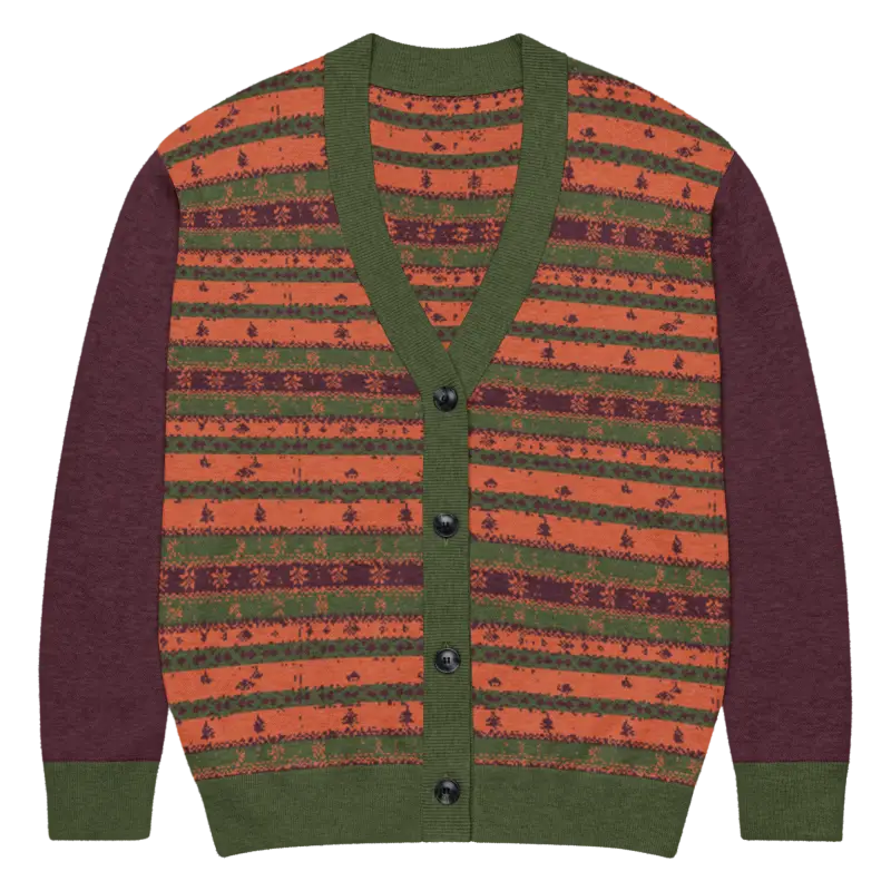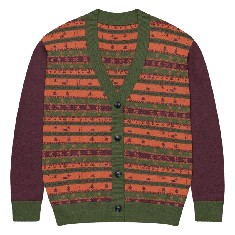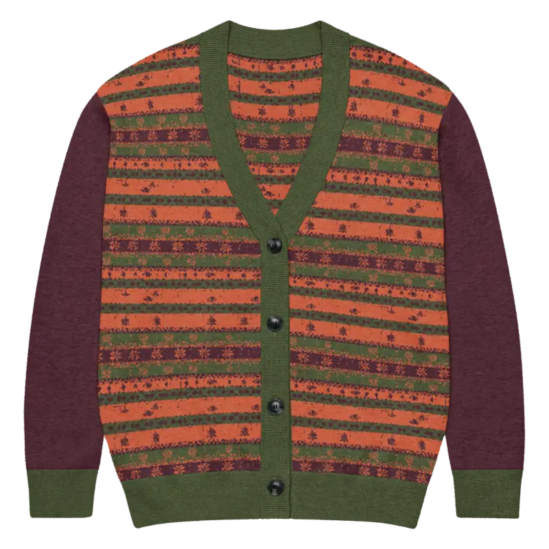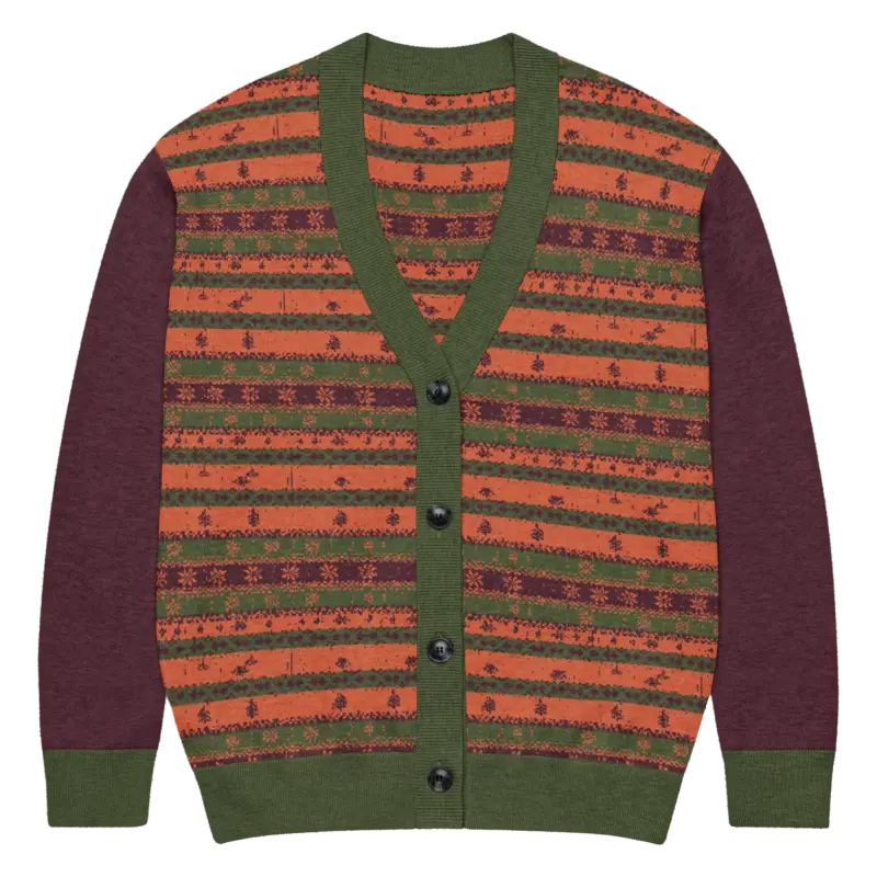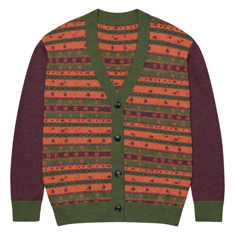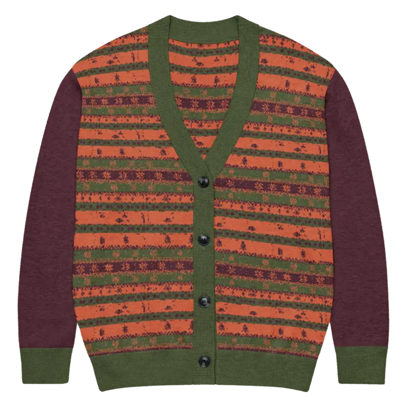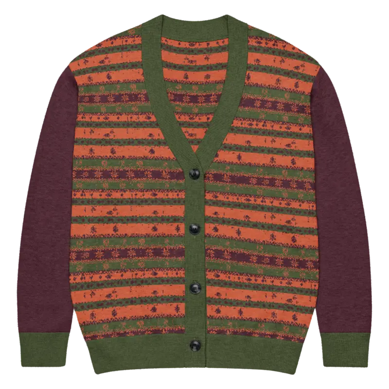The stunning burgundy green color combination creates an earthy, sophisticated palette that works beautifully with everything in your wardrobe. Those gorgeous green striped details add visual interest and depth, making this cardigan a true standout piece. The jacquard knit construction brings a luxurious texture that catches the light beautifully and adds a modern, elevated touch to this classic design. This is not just another cardigan, it is the piece that pulls your whole outfit together with minimal effort.
