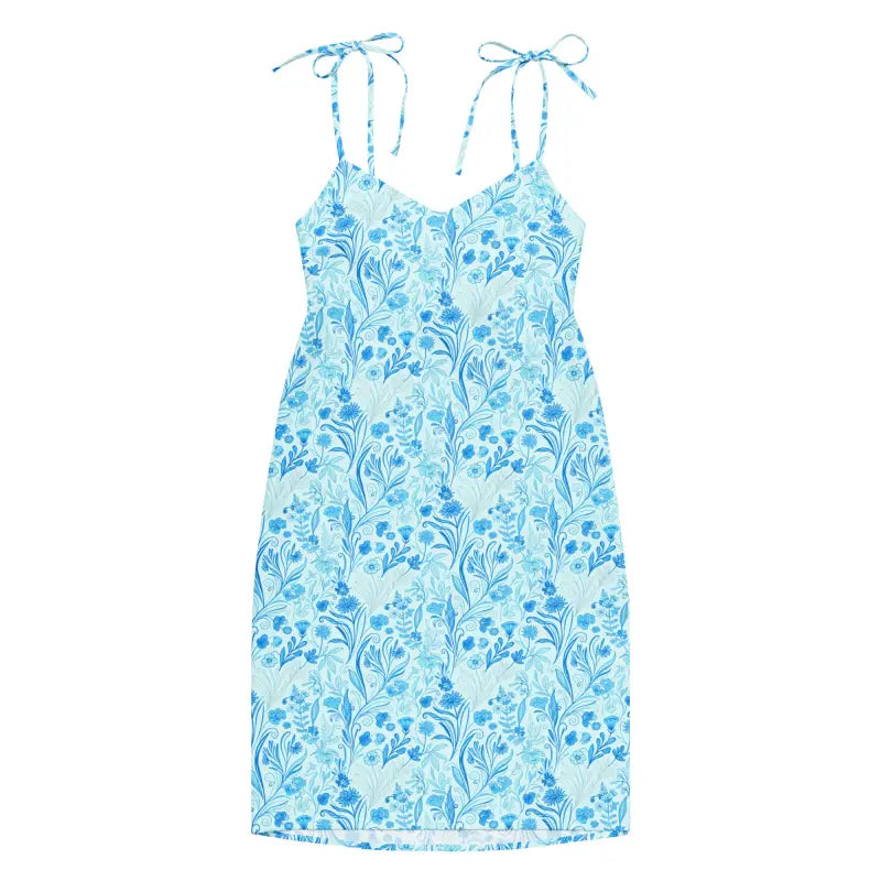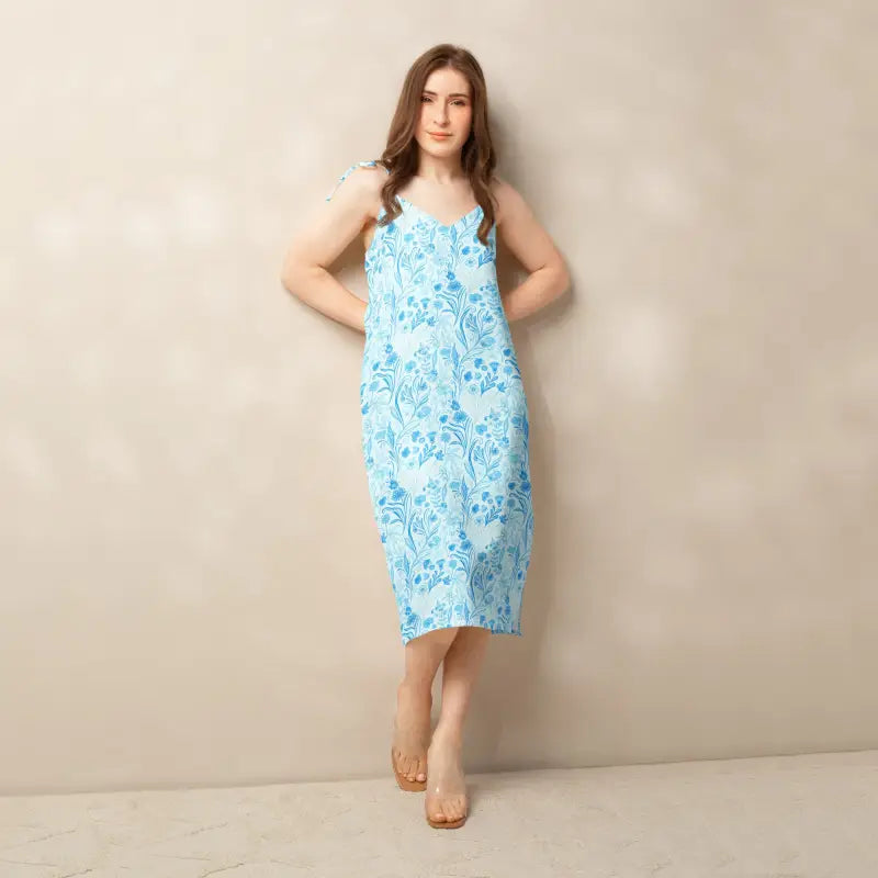 Picture yourself stepping into a sun-drenched garden party, a gentle breeze catching the hem of your dress as heads turn to admire the gorgeous capri blue floral pattern dancing across the fabric. This isn't just another midi dress—it's your new secret weapon for looking absolutely incredible without even trying. The moment you slip into this beauty, you'll feel the lightweight chiffon cascade over your curves, the adjustable tie straps settling perfectly on your shoulders while the built-in bra gives you that confident, supported feeling that lets you focus on having an amazing time instead of fussing with your outfit. Every detail has been designed to make you feel like the best version of yourself, from the flirty side slit that adds just the right amount of allure to the floaty silhouette that flatters every body type. The capri blue backdrop brings out a fresh, vibrant energy while the delicate floral motif adds a touch of romance that works beautifully whether you're brunching with friends, attending a summer wedding, strolling through weekend farmers markets, enjoying date night at that new rooftop restaurant, or dancing the night away at outdoor concerts.