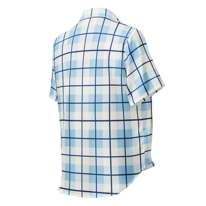 The vibrant capri blue tones and cool plaid design create a fresh, modern vibe perfect for lounging, sleeping, or sipping your morning coffee in style. Its relaxed fit and satin-smooth texture make every moment feel like a mini escape.