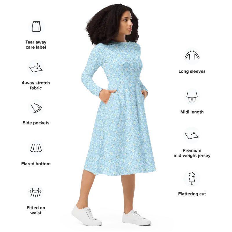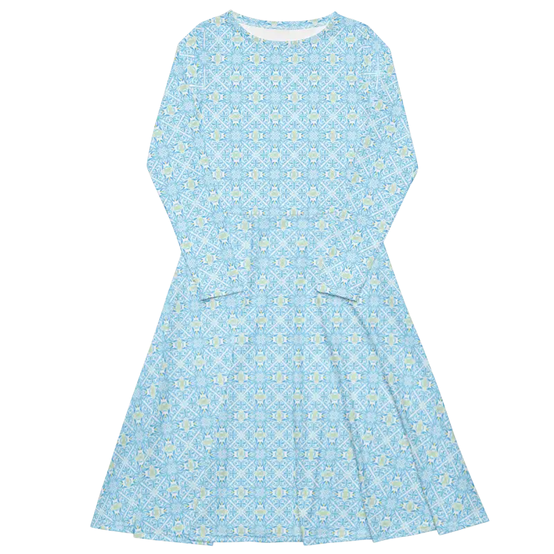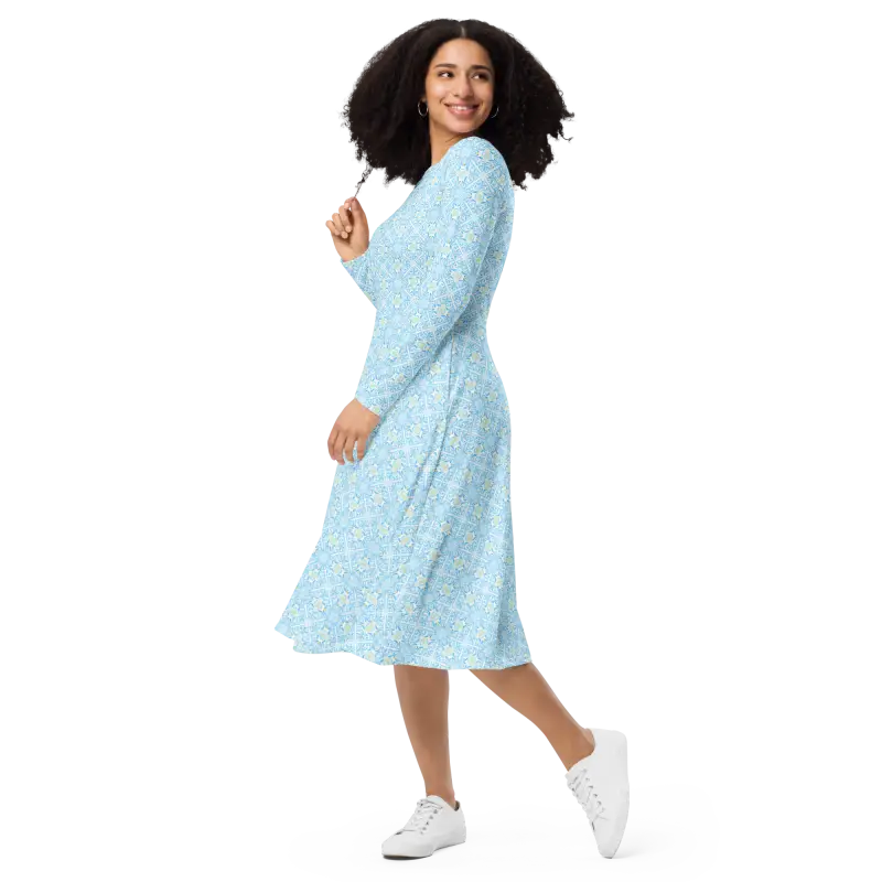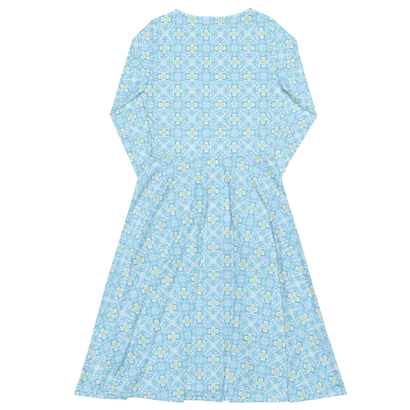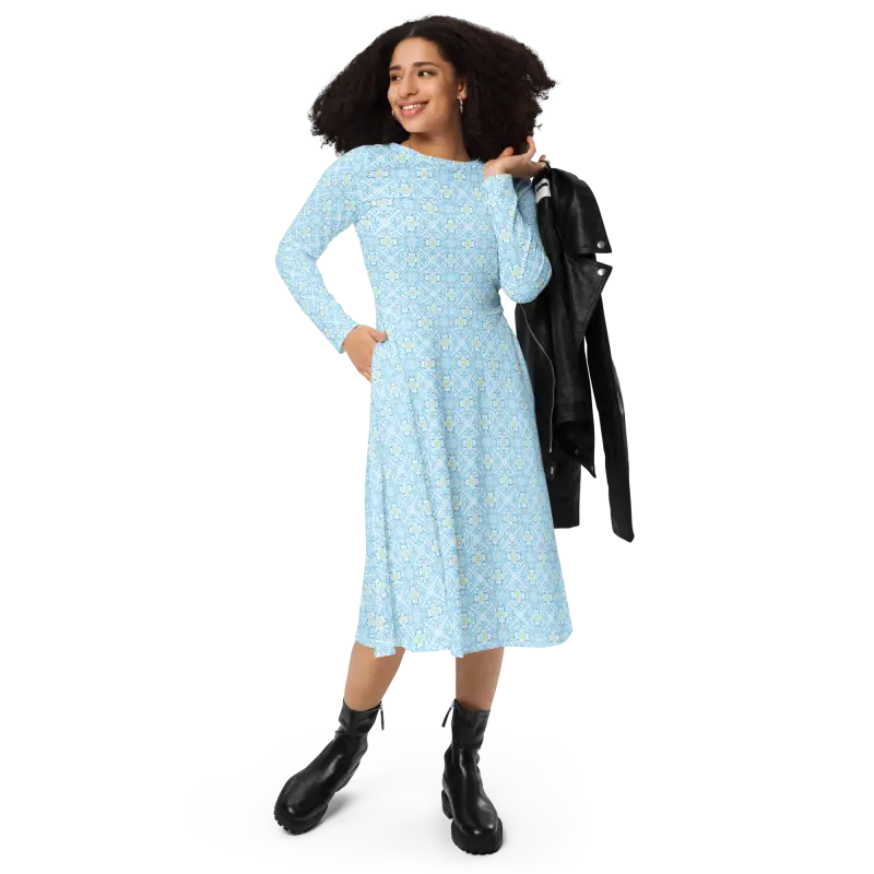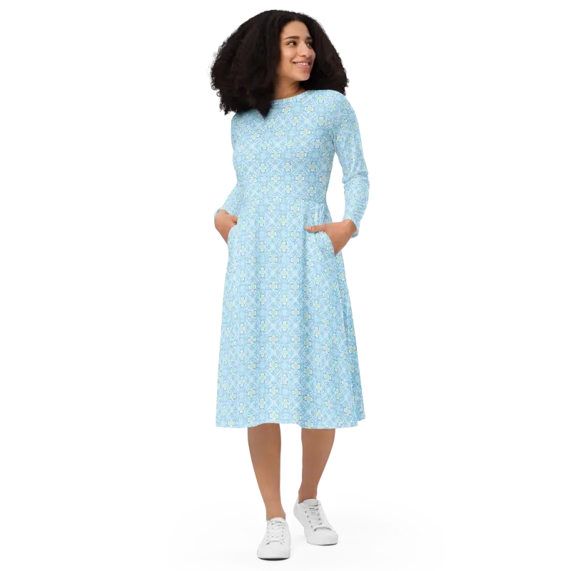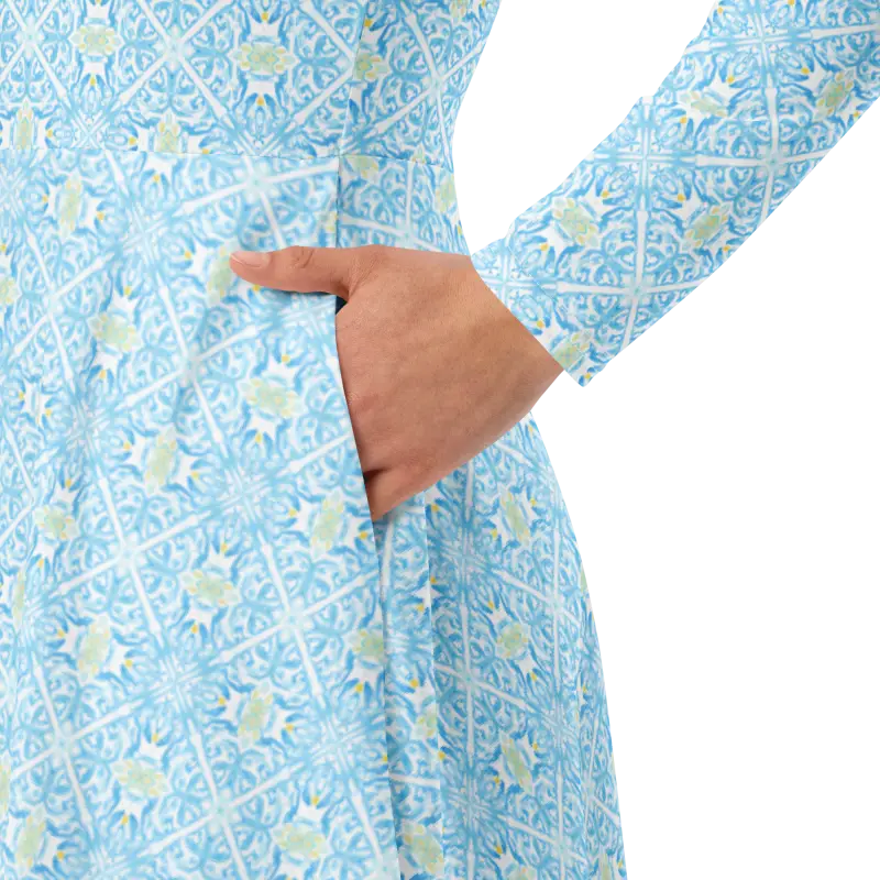 Capri Blue Medallion Print Long Sleeve Midi Dress with Pockets