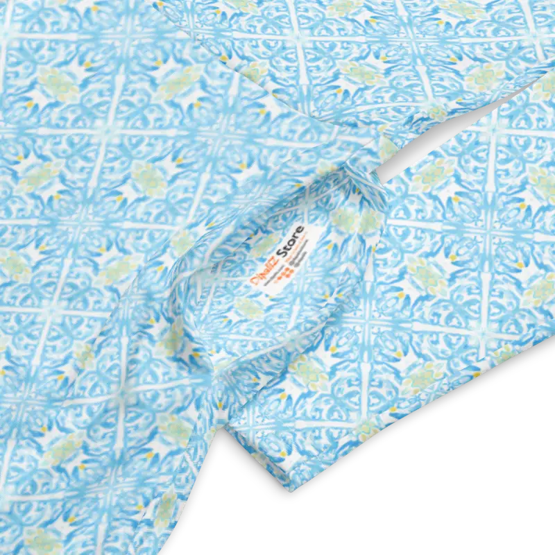A swirl of medallion motifs in rich capri blue tones for a bold yet feminine finish.