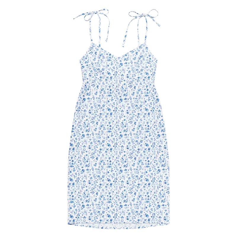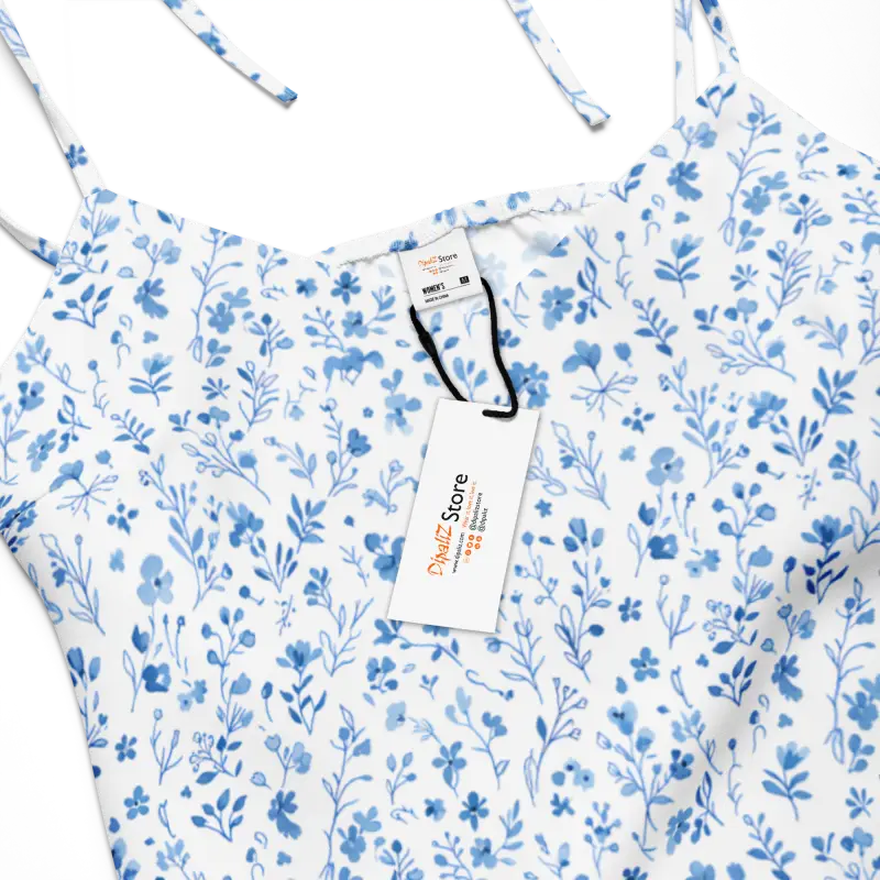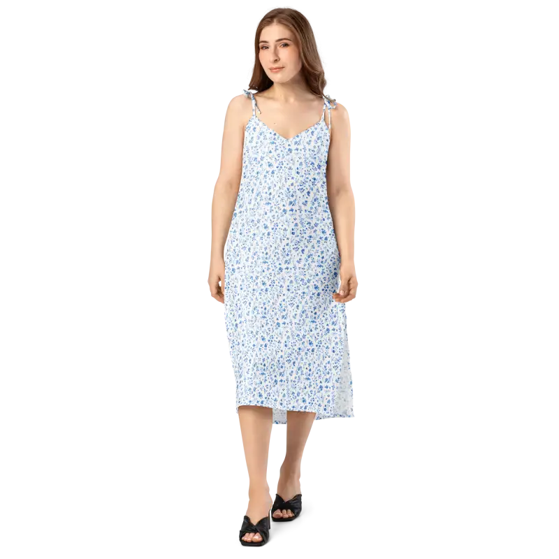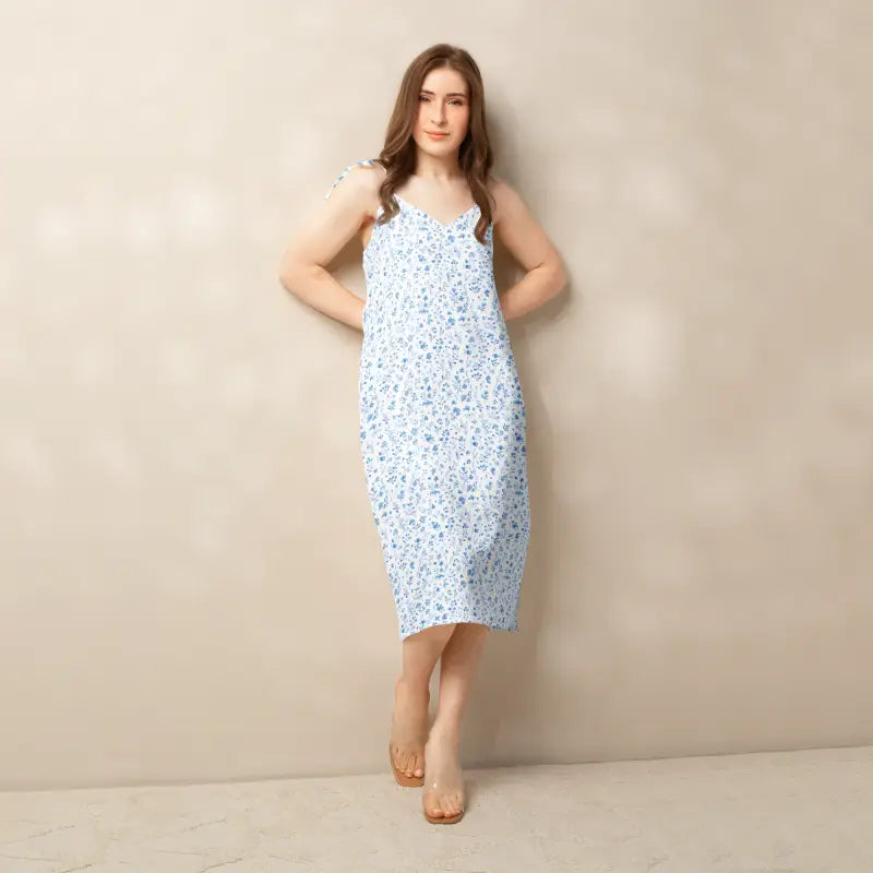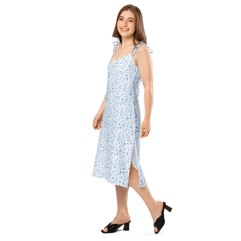 Feel the sunshine and soft breeze in this dreamy midi dress, where the capri blue small floral pattern dances with every step. Light, airy, and irresistibly flattering, it’s your go-to for brunches, beach walks, or sunset dinners.