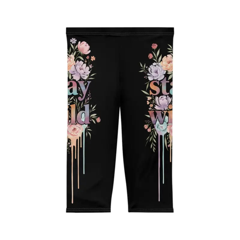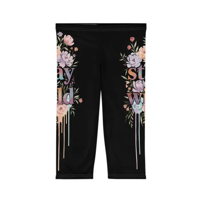 Picture yourself mid-stride on a sun-drenched trail, the soft brush of premium fabric against your skin as delicate florals cascade down your legs in a stunning wild drip design that turns heads at every corner. These capri leggings aren't just another pair of workout pants—they're your statement piece that says you refuse to choose between fierce athleticism and unapologetic femininity. The moment you slip them on, you'll feel the difference: a buttery-smooth, brushed-suede texture that glides against your skin while moisture-wicking technology keeps you cool and confident through every movement. The deep black canvas serves as the perfect backdrop for the intricate floral stay wild artwork, where delicate blooms seem to melt into artistic paint-drip accents that create an edgy, contemporary vibe. Whether you're crushing a HIIT session at the gym, running weekend errands with an oversized hoodie, meeting friends for coffee in a flowy tunic, heading to yoga class paired with your favorite studio tank, or simply lounging at home while still looking put-together, these versatile capris transition seamlessly through your entire day without missing a beat.