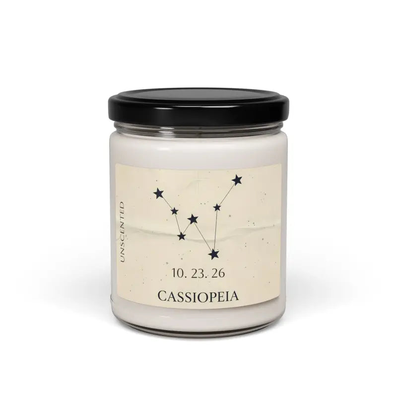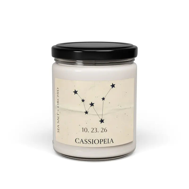 Picture this: you strike a match, the wick catches, and suddenly your space glows with soft amber light while a carefully chosen scent wraps around you like a warm embrace. This cassiopeia constellation soy candle transforms any ordinary evening into something magical, marking a date that matters to you—a first kiss, a wedding day, an anniversary, a moment the stars aligned just right. The flickering flame dances inside premium glass while the clean burn of natural soy wax releases fragrance that shifts and deepens as the hours pass. You are not just lighting a candle; you are honoring a memory, celebrating a milestone, creating atmosphere that speaks to who you are and what you treasure. This personalized date astrology candle becomes part of your ritual, whether you are unwinding after a chaotic day, setting the mood for intimate conversation, or simply claiming a few precious minutes of peace in your favorite corner of home.