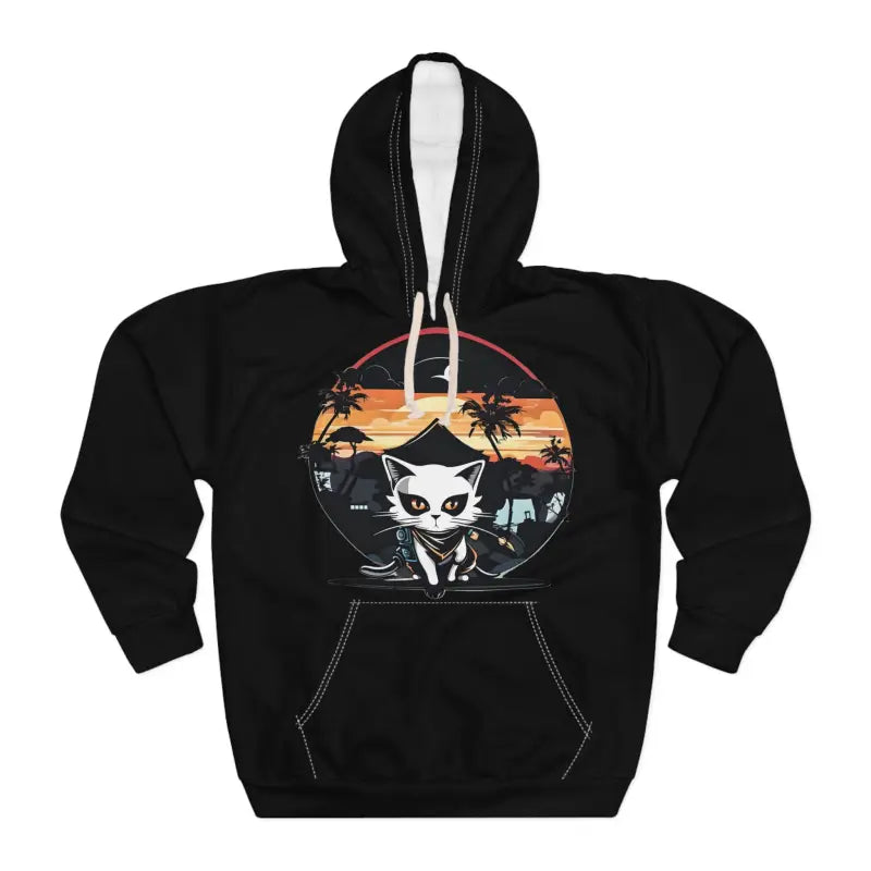 Cat Samurai Hoodie — Retro Japanese All-Over Print Pullover. A bold, all-over print hoodie that channels retro Japanese samurai vibes into everyday wear. The Cat Samurai design brings playful edge and warrior spirit—vivid color, crisp lines, and full-wrap artwork that moves with you. Medium-weight fabric keeps you warm without weighty bulk. A roomy kangaroo pocket and adjustable drawstring hood add practical comfort for wandering city streets, late-night ramen runs, or cozying up at home. Cut and sewn so the artwork aligns across seams, this hoodie wears like a statement piece: nostalgic, slightly mischievous, and made to be lived in.