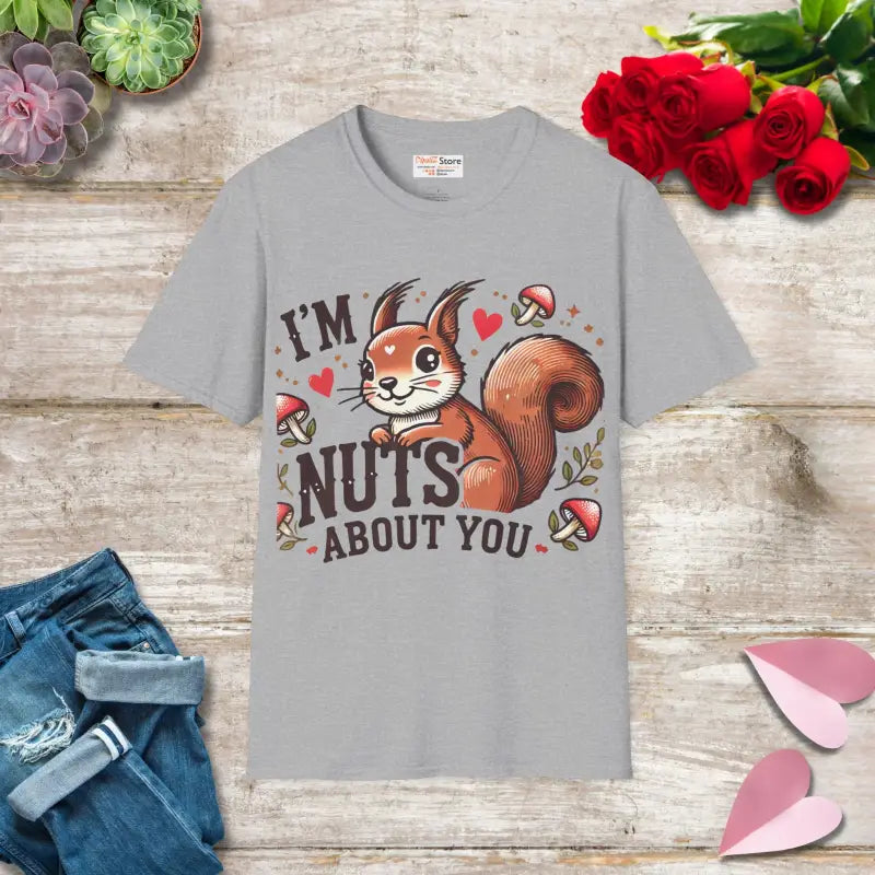 I'm Nuts about you, Squirrel, Unisex Softstyle T-Shirt. The unisex soft-style t-shirt puts a new spin on casual comfort. Made from very soft materials, this tee is 100% cotton for solid colors. The shoulders have twill tape for improved durability. There are no side seams. The collar is made with ribbed knitting to prevent curling damage.
