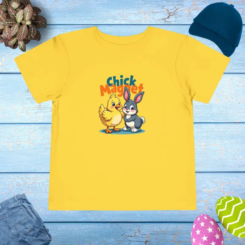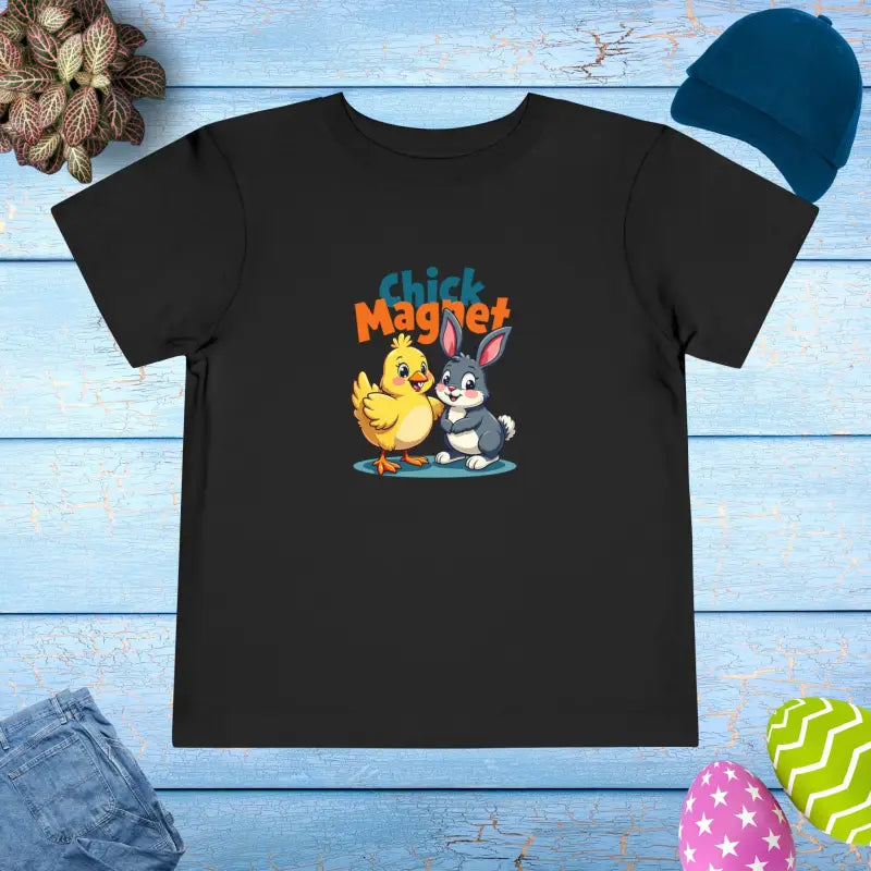 Get ready to add a burst of fun to your toddler's wardrobe with our Bunny Rabbit Chick Magnet - Toddler Short Sleeve Tee. This exciting short sleeve tee features a vibrant bunny and chick design that instantly makes a statement. The playful print of bunny rabbit and chick magnet themes is perfect for little ones who love to explore and express their unique style. This tee is designed to be a dress-up staple for any fun day out or playdate with friends.
