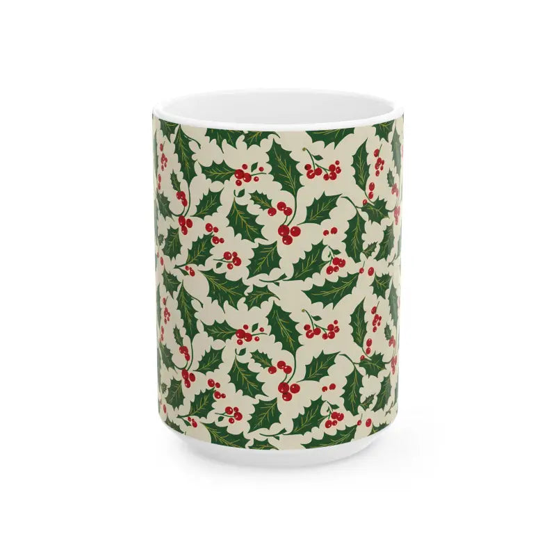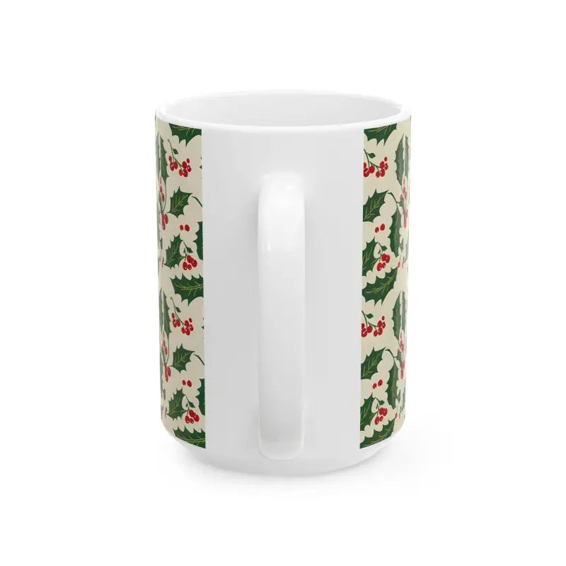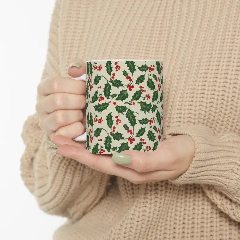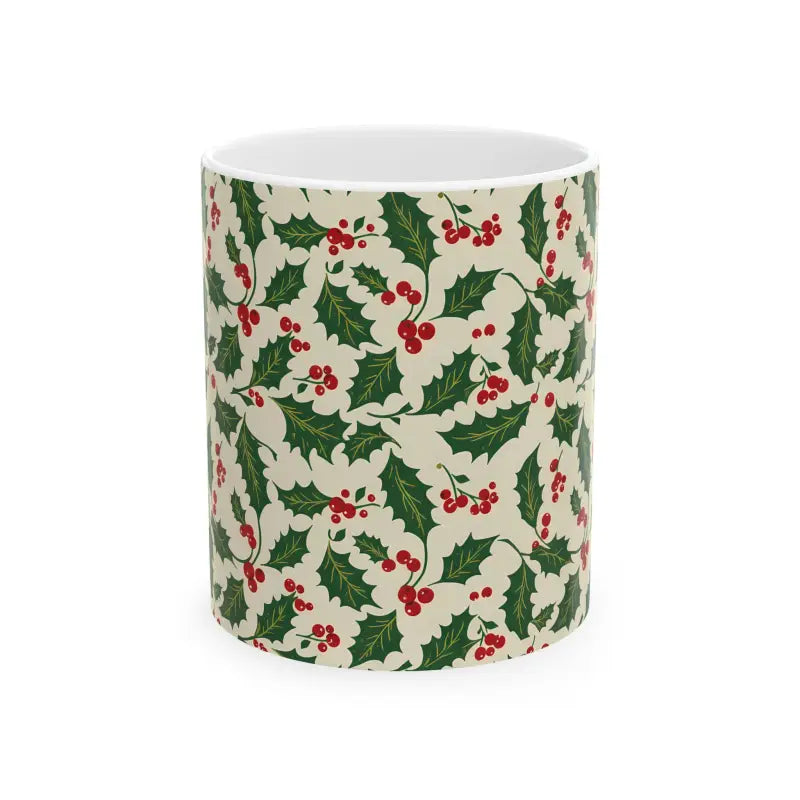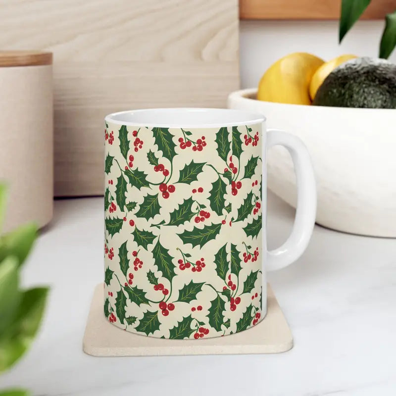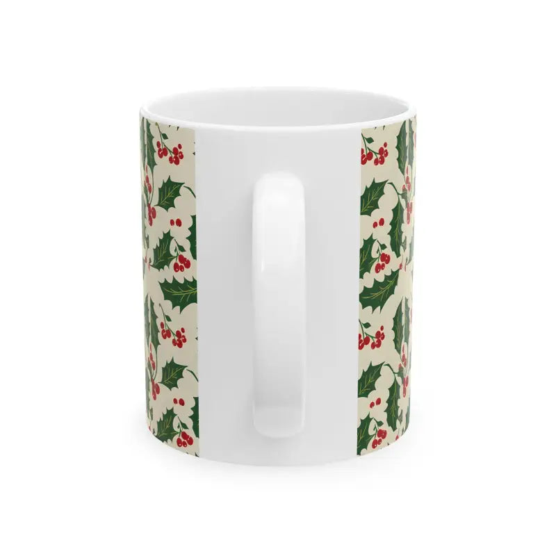 Christmas Holly Pattern Ceramic Mug - Festive Holiday Cup - DipaliZ