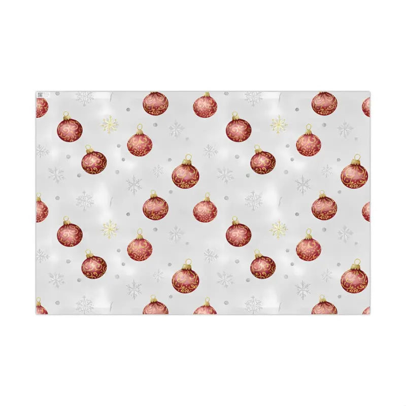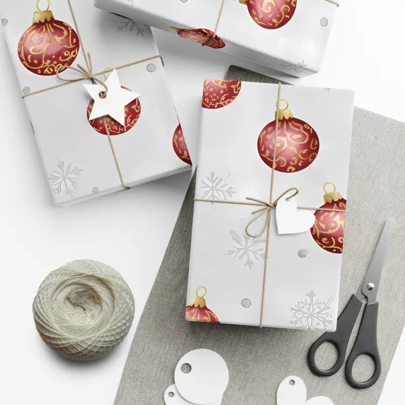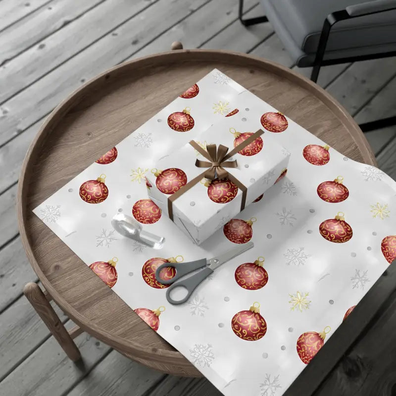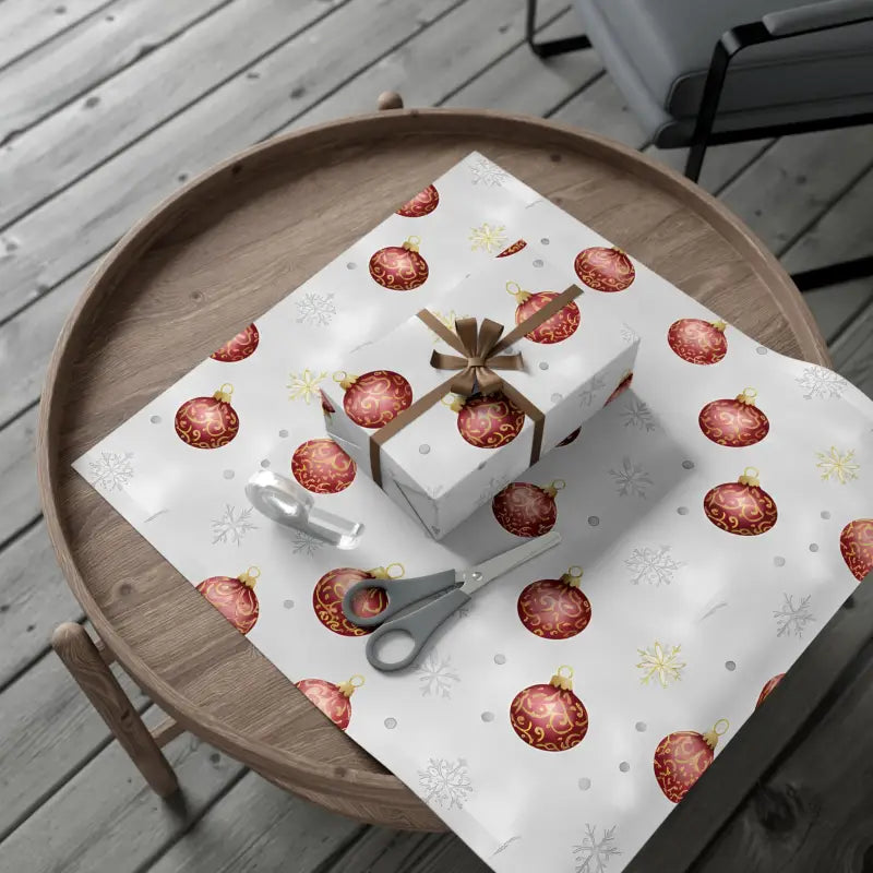 Picture soft white paper adorned with classic red baubles that seem to glow with nostalgic warmth, complemented by delicate snowflake accents that dance across the surface. This ornament gift wrap captures the essence of cozy winter evenings and candlelit gatherings, creating an instant feeling of home and heritage. The vintage-inspired design strikes that perfect balance between festive cheer and sophisticated style, making every package look like it came straight from a holiday storybook.