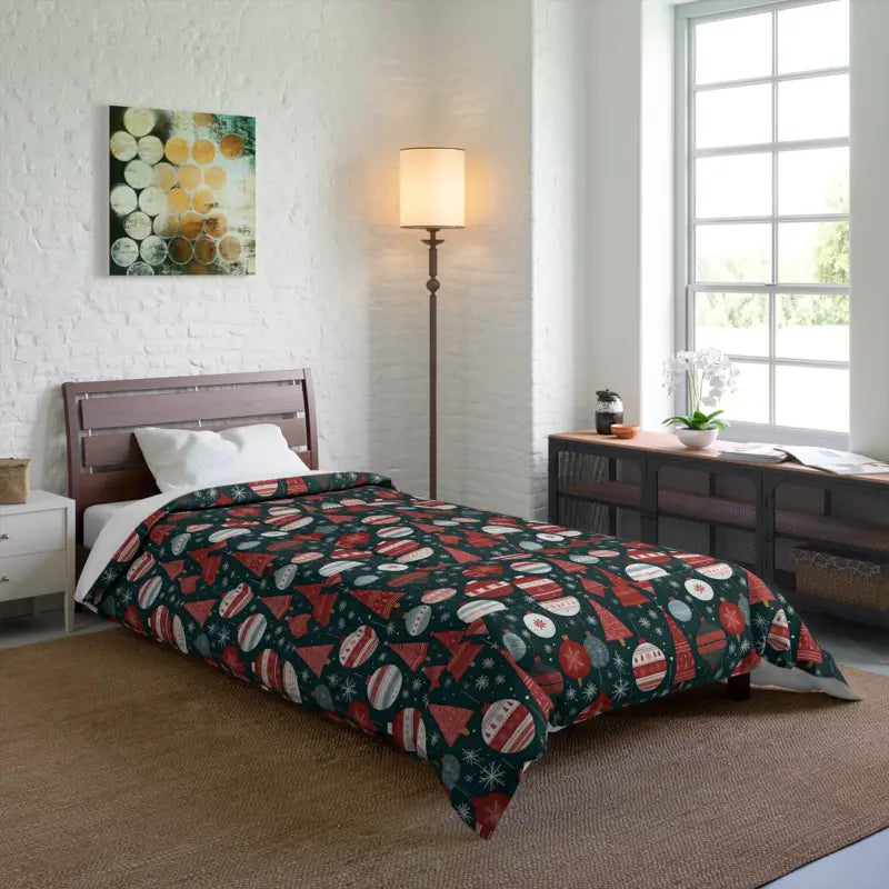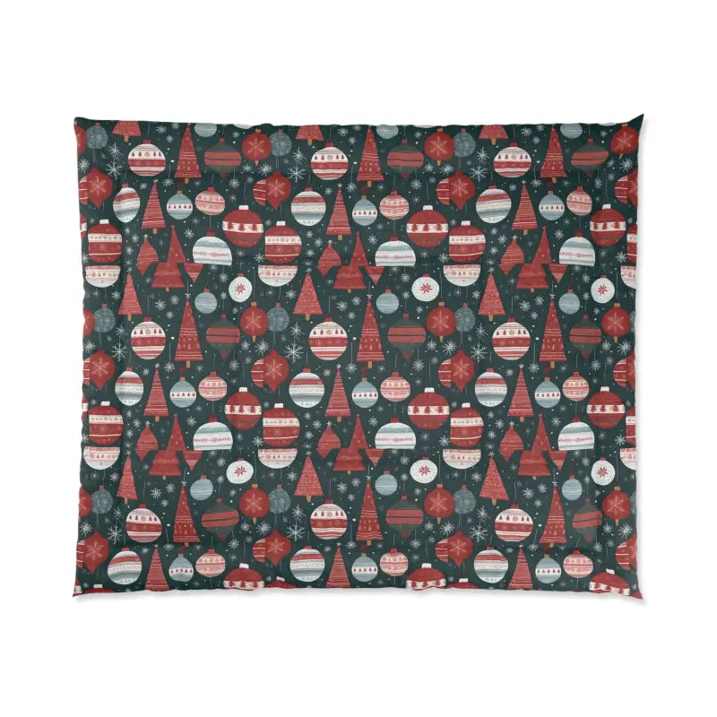 Cozy Christmas Tree Comforter — Fluffy Holiday Ornament Print. Pull the covers up and let the hush of a Christmas morning settle in. This plush comforter wraps you in cloud-like softness—lightweight yet warmly insulating—so you can linger in bed with a warm mug as holiday light filters through the curtains. The one-sided print features festive ornaments and a decorated tree rendered in bright, crisp color that keeps the room feeling joyful and alive without overpowering the space. Thoughtful double square quilting secures the cozy batting for even loft and lasting structure, while the clean white reverse keeps the look fresh when the bed is made. It’s for slow winter mornings, quiet evenings by the tree, and anyone who wants seasonal cheer folded into everyday comfort.