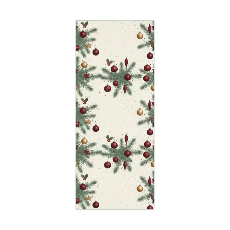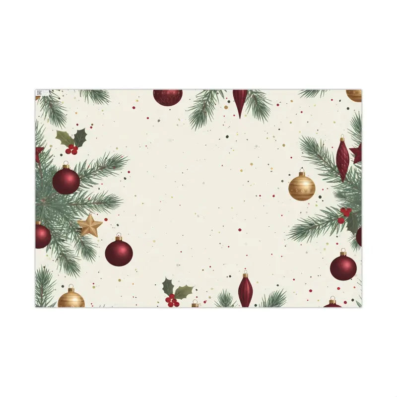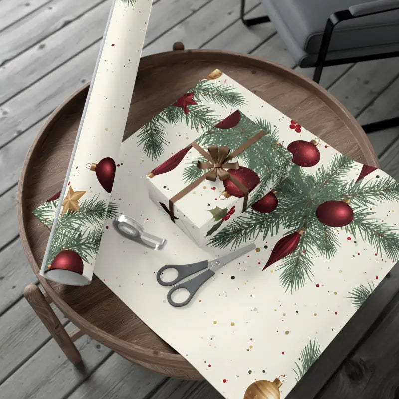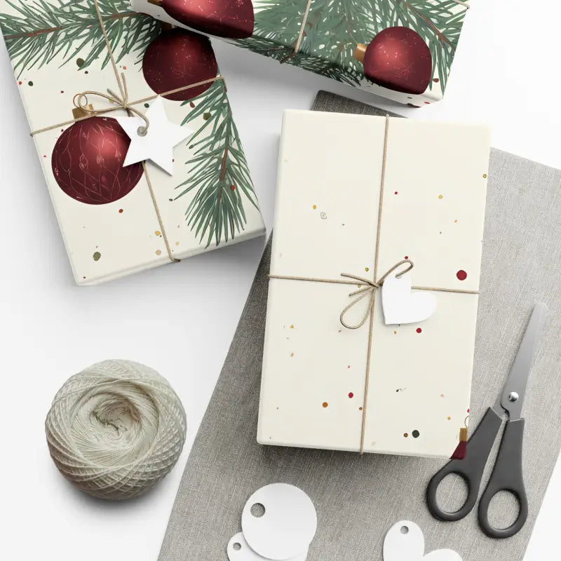 Transform every gift into a stunning seasonal masterpiece with this gorgeous Christmas Baubles Gift Wrap that captures all the magic and wonder of the holidays. Each sheet features delicate pine branches adorned with rich red and gold ornaments against a creamy backdrop dotted with speckles that look just like freshly fallen snow.