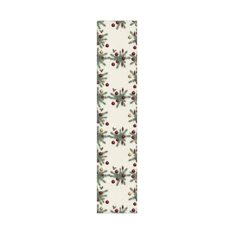 The pattern showcases hand-drawn style pine branches intertwined with glossy baubles in deep crimson and antique gold, all dancing across that gorgeous cream canvas with playful snow speckles adding movement and magic throughout.