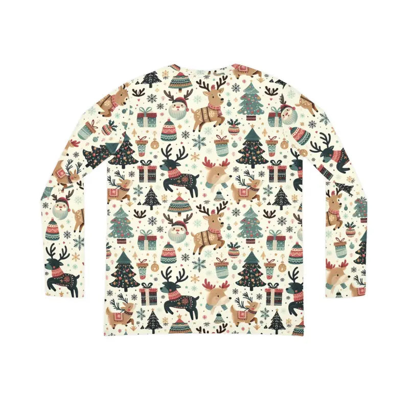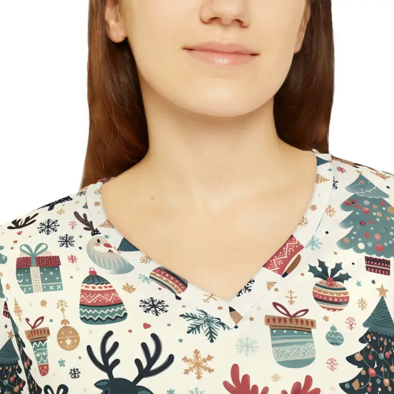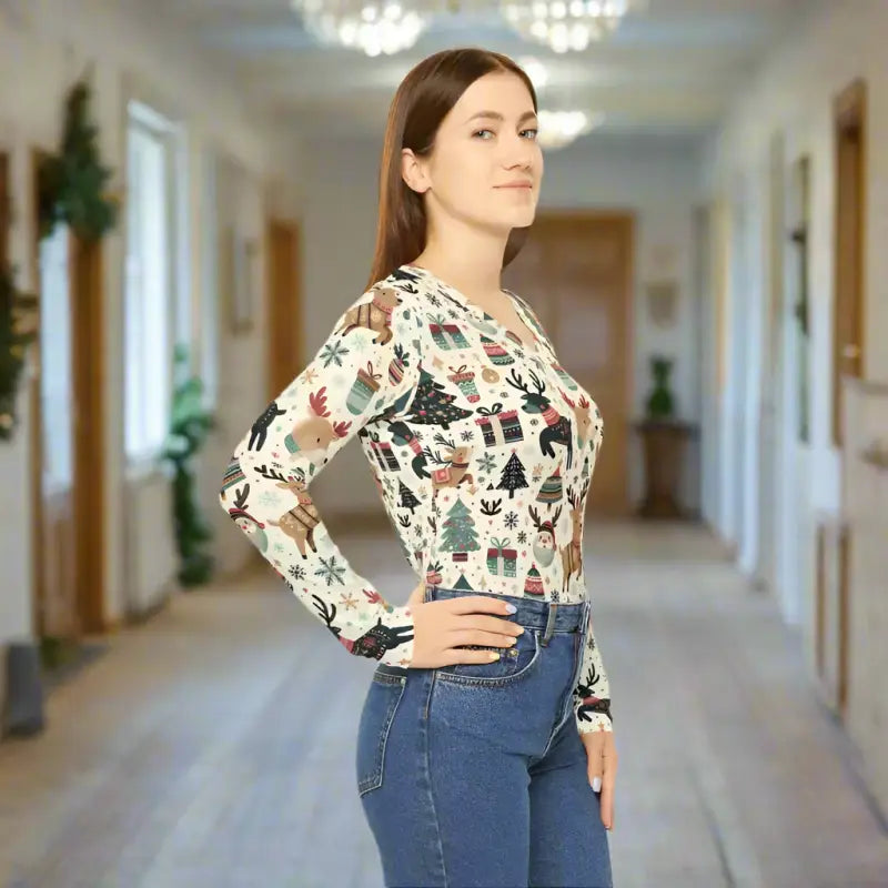 Get ready to dazzle this holiday season with our stunning long-sleeve V-neck top, adorned with a whimsical Christmas reindeer and tree pattern. This shirt effortlessly blends style and comfort, with a luxurious fabric mix of 95% polyester and 5% spandex. It's perfect for everything from casual gatherings to festive parties, making it a versatile addition to your wardrobe.