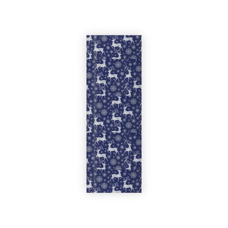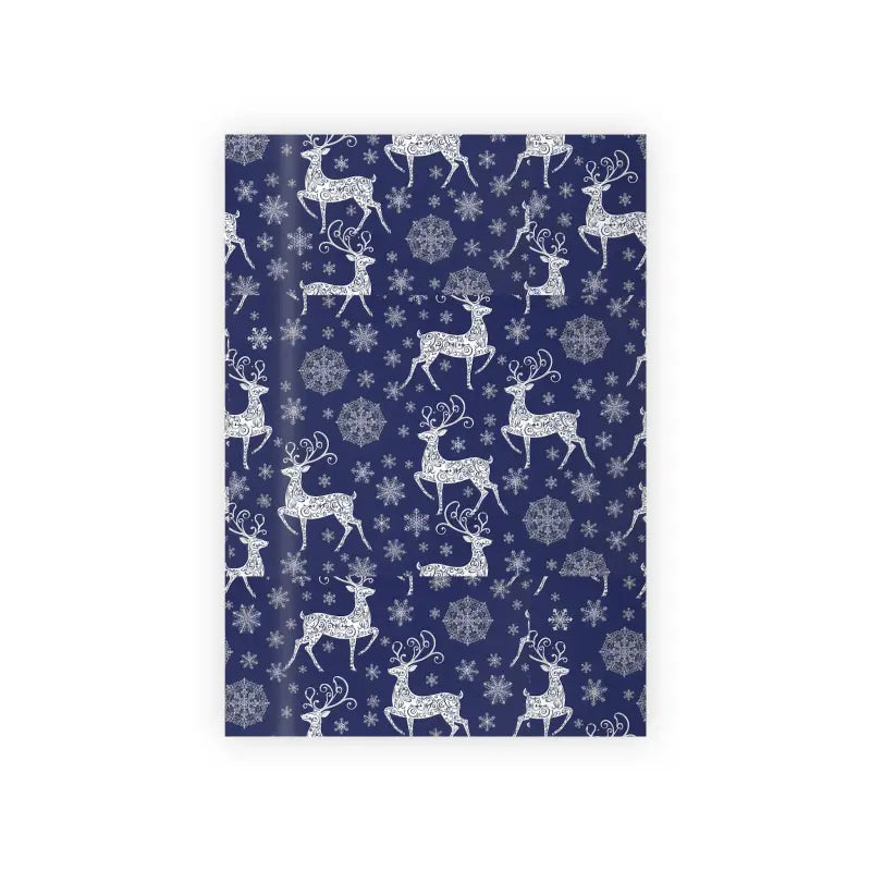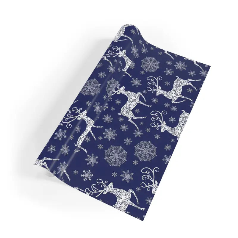 The rich navy background is dotted with hand-drawn reindeer silhouettes and delicate snowflakes in crisp white, creating a festive motif that feels both whimsical and refined A subtle sheen catches the light for an elegant, glow-like effect perfect for holiday charm or special celebrations
