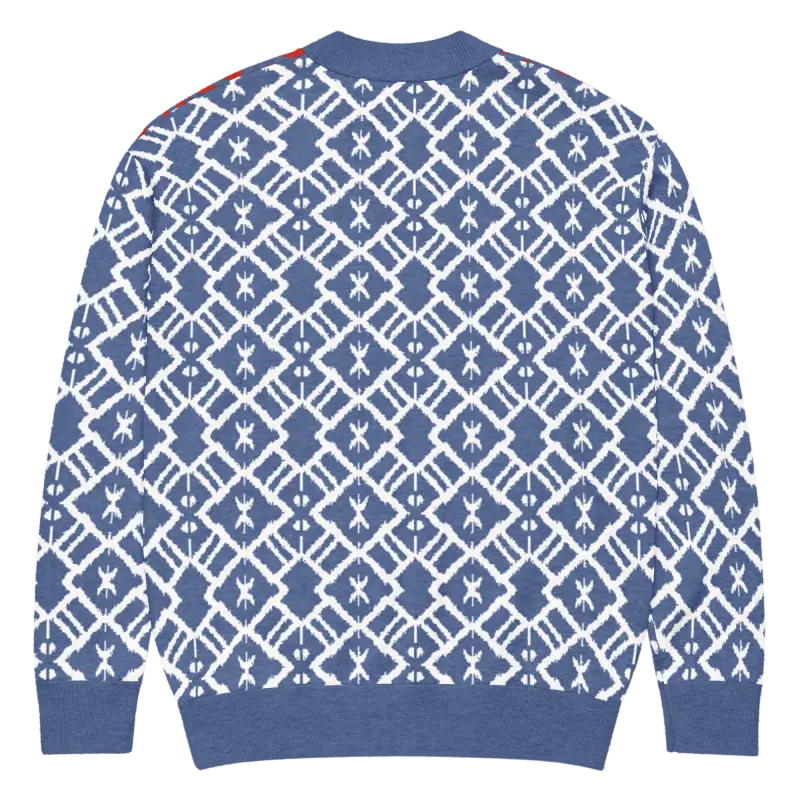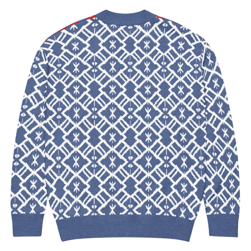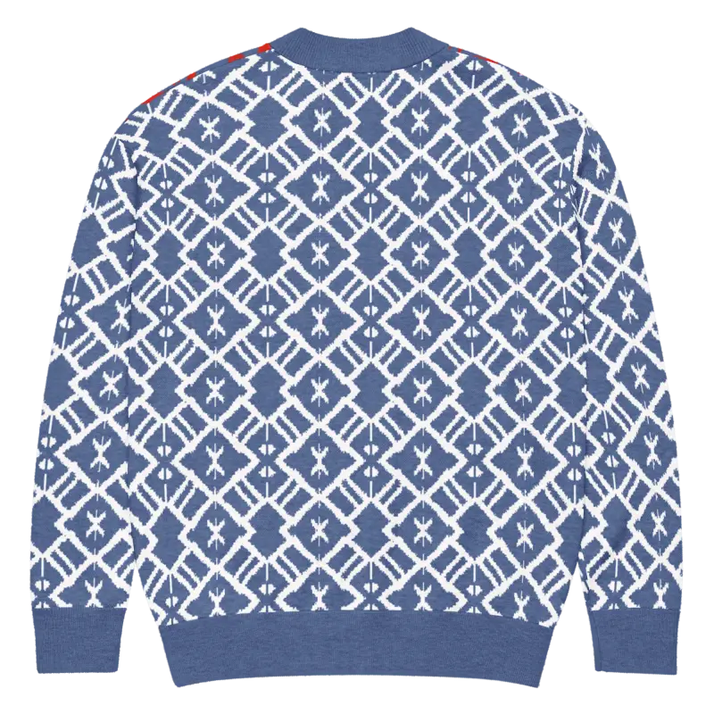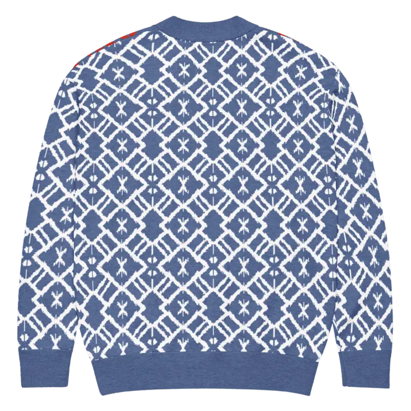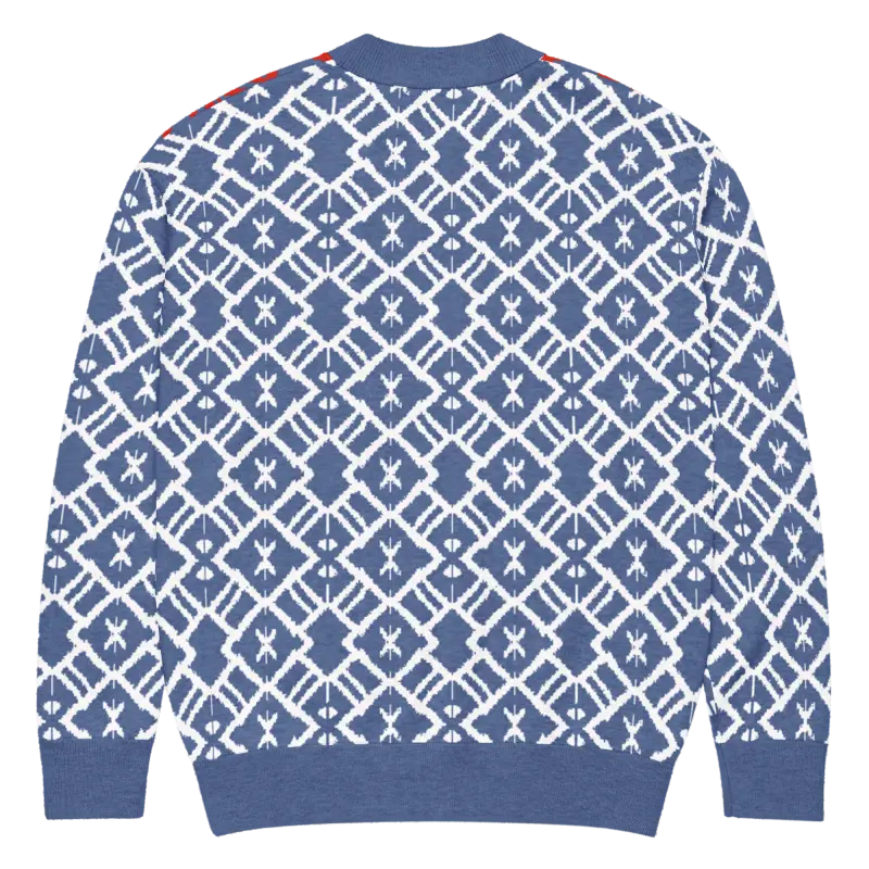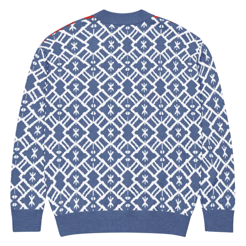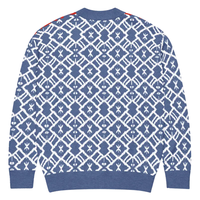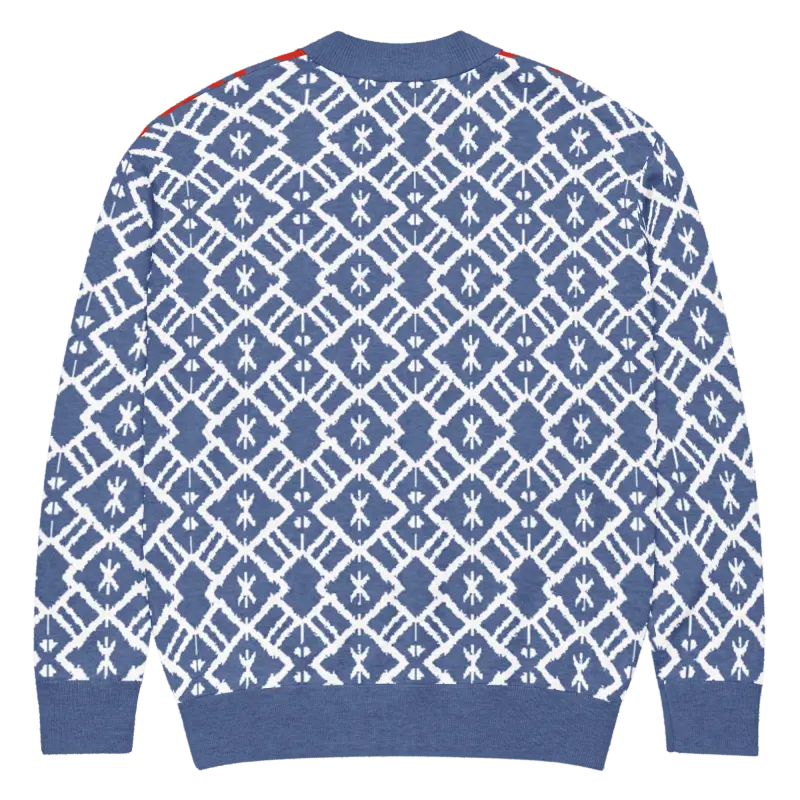 The burgundy and blue color palette creates visual interest through contrasting warm and cool tones that complement every skin tone beautifully. Geometric patterns flow across the sleeves in an artistic display that showcases modern knitwear design at its finest.
