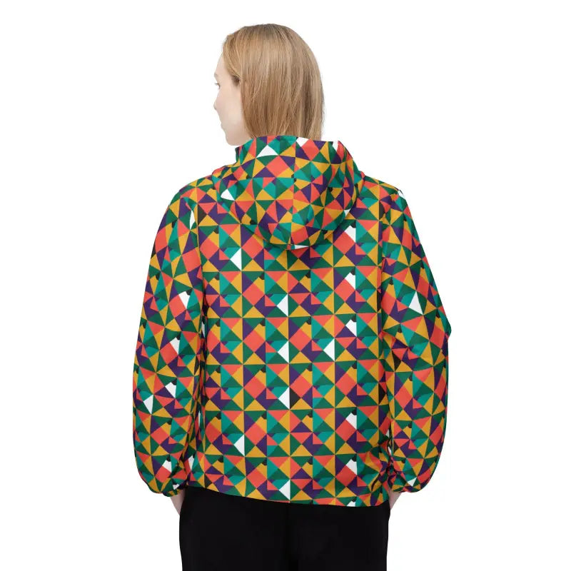 Colorful Geometric Triangle Print Windbreaker Jacket.This lightweight windbreaker wraps you in bright, geometric energy — a lively mosaic of triangles in warm ochres, teal, coral and forest green. Breathable 100% polyester keeps the silhouette crisp and dry while the full zipper and elastic cuffs hold back gusts on blustery days. Stash small essentials in the side pockets, hood up for extra coverage, and let the all-over print transform an ordinary commute or weekend wander into something colorful and unexpected. It runs slightly small; choose a size up if you prefer a roomier fit.