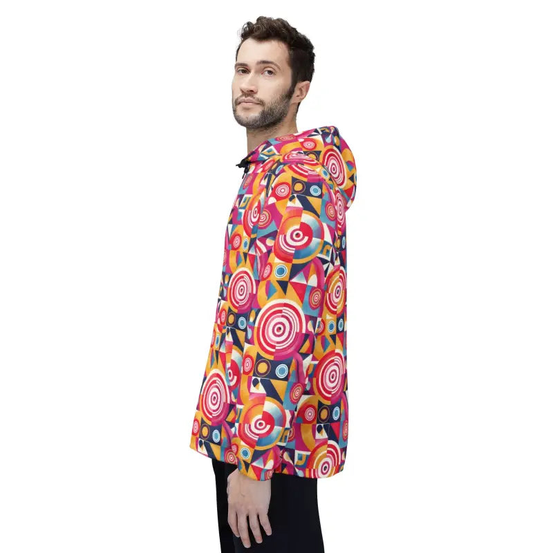 Colorful Geometric Windbreaker Jacket – Retro Pop Art Circles AOP. This lightweight windbreaker brings a splash of joyful color to rainy walks, city commutes, or weekend festivals. The all-over abstract pattern—bold spirals, geometric blocks and sunburst tones—feels playful and energetic, like carrying a pocket of summer on overcast days. It moves easily with you: quick-drying polyester, elastic cuffs for a secure fit, and a full front zipper that lets you layer on cool mornings or zip up when the wind picks up. Two roomy side pockets keep your hands warm or stow small essentials. Bright, durable prints hold up through wear, so the jacket stays vibrant trip after trip. If you gravitate toward artful street style, outdoor markets, or creative gatherings, this windbreaker slips into that life naturally — colorful, light, and ready for whatever the day brings.