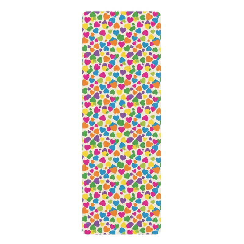 This vibrant heart pattern rubber yoga mat features a delightful scatter of multicolored hearts across its surface, creating an uplifting visual that makes you smile the moment you unroll it. The cheerful design combines bold reds, sunny yellows, cool blues, and soft pinks in a pattern that radiates positive energy.