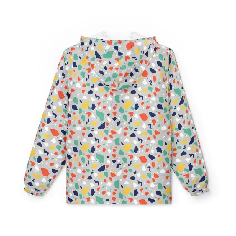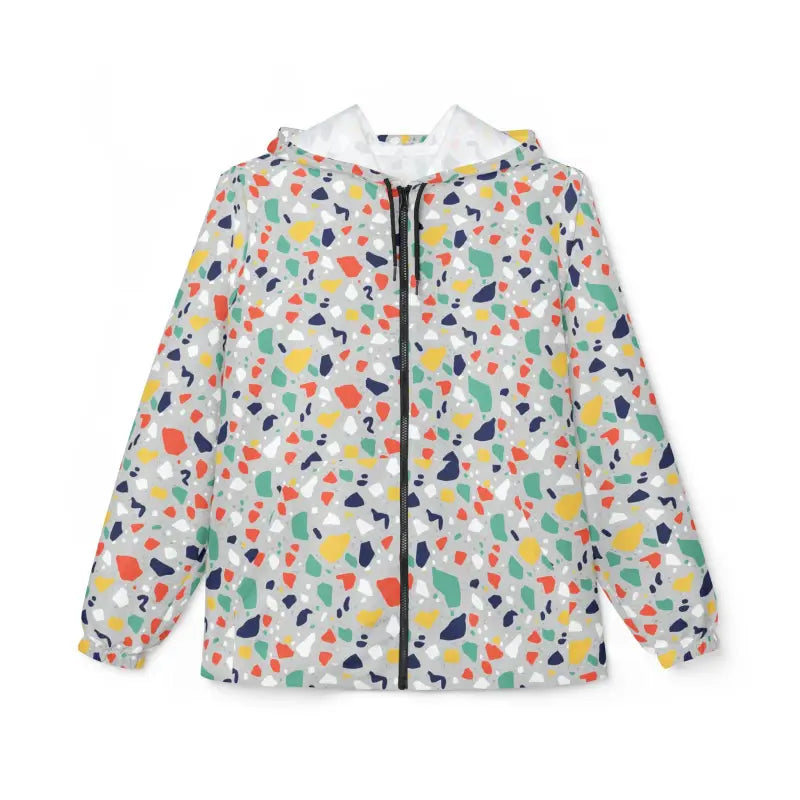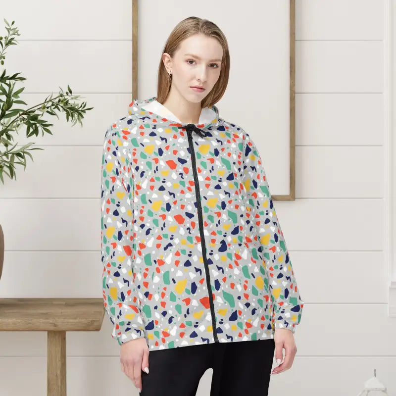 Picture this: you step outside and the wind kicks up, but instead of retreating indoors, you zip up and smile because your colorful terrazzo print windbreaker just turned a blustery morning into your personal runway. This isn't just another boring rain jacket hiding in your closet—it's a full-blown mood lifter wrapped in coral, mint, navy, and gold confetti bursts that make every sidewalk feel like a celebration. The moment you slip into this pattern hooded shell, you'll feel the whisper-light polyester settle against your shoulders like it weighs nothing at all, yet somehow it's tough enough to laugh off drizzle and gusty days without breaking a sweat. That satisfying zip-up sound when you pull the front closure tells you you're locked in and ready for whatever the sky throws your way. The elastic cuffs hug your wrists just right—snug enough to keep the chill out but never restrictive—while the roomy side pockets become instant homes for your phone, keys, and that granola bar you grabbed on your way out. This terrazzo print windbreaker moves with you like a second skin, whether you're power-walking to catch the morning train, browsing farmers market stalls on Saturday, jogging through the park when clouds threaten, meeting friends for outdoor brunch, or simply running errands around town while looking effortlessly put-together.