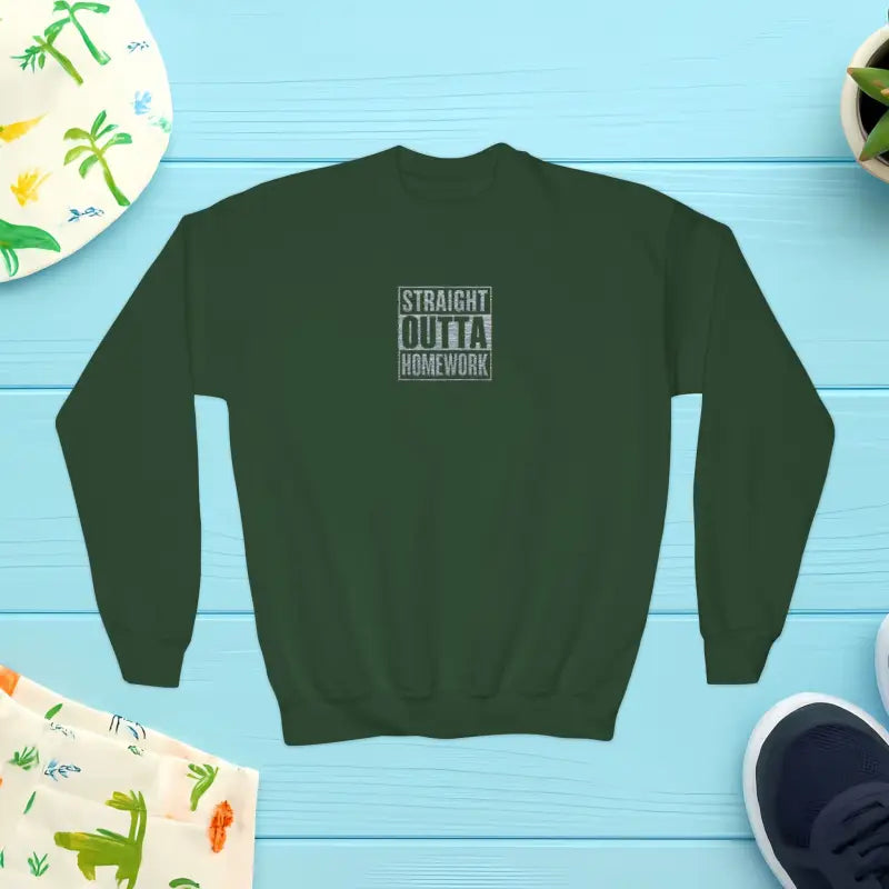 Kick back in this supremely soft youth crewneck sweatshirt that feels like a warm hug right out of the dryer. With its playful cool straight outta Homework graphic embroidered front and center, you’ll see why this crewneck sweatshirt is the perfect sidekick for every chill day or epic school moment.