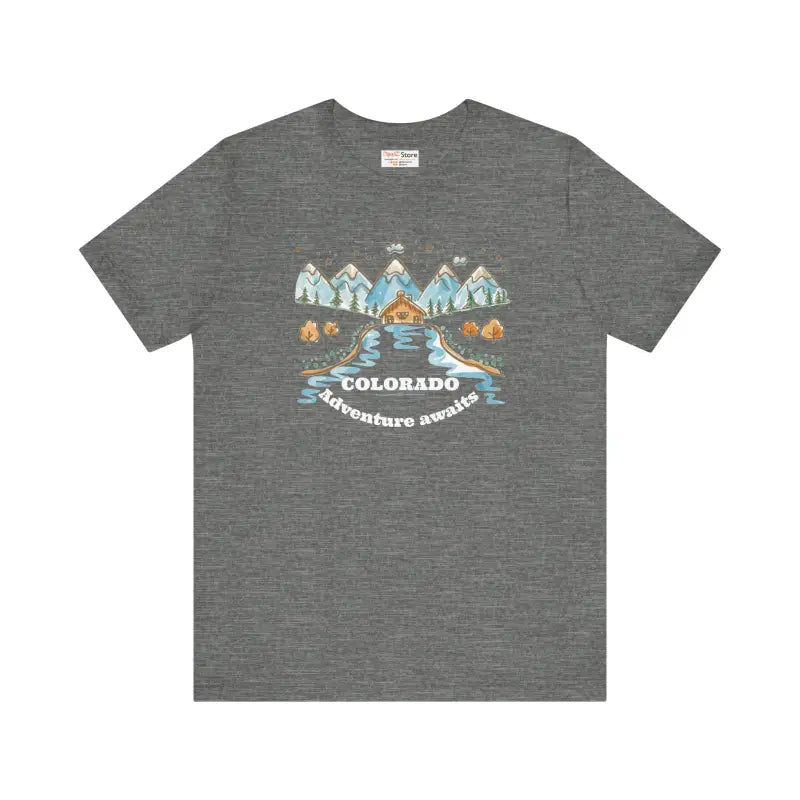 Colorado, Adventure Awaits, Unisex Jersey Short Sleeve Tee. This classic unisex jersey short sleeve tee fits like a well-loved favorite. Soft cotton and quality print make users fall in love with it over and over again. These t-shirts have-ribbed knit collars to bolster shaping. The shoulders are tapered for a better fit over time. Dual side seams hold the garment's shape for longer.