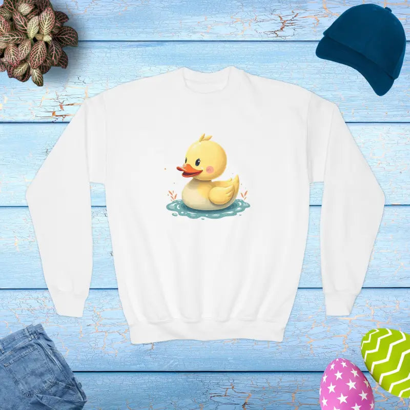 Features like the vibrant cute duck youth print and comfortable, durable fabric make our youth crewneck sweatshirt a must-have addition to any young one's wardrobe. Whether your child is celebrating birthdays or enjoying a day at school, this crewneck sweatshirt is designed to keep them stylish while radiating a fun, youthful vibe.