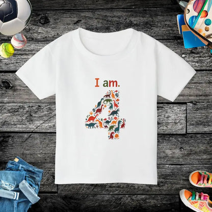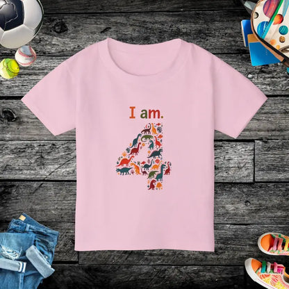 Let your four-year-old roar with excitement in this dinosaur themed toddler t-shirt, the perfect choice for fun kids apparel. Show off your little one's milestone with a super bright and playful design featuring friendly dinosaurs and a bold I am 4 statement. This vibrant themed toddler tee stands out at every playdate, making it an instant favorite in any fun kids apparel collection for ages three to four. Perfect for parties, family photos, holiday gatherings or just daily adventures, this dinosaur themed toddler t-shirt will bring smiles all year long.