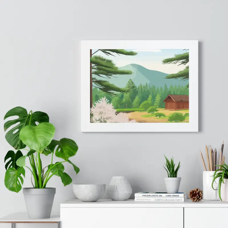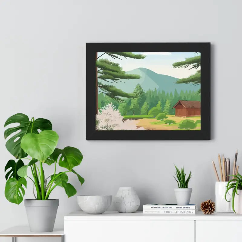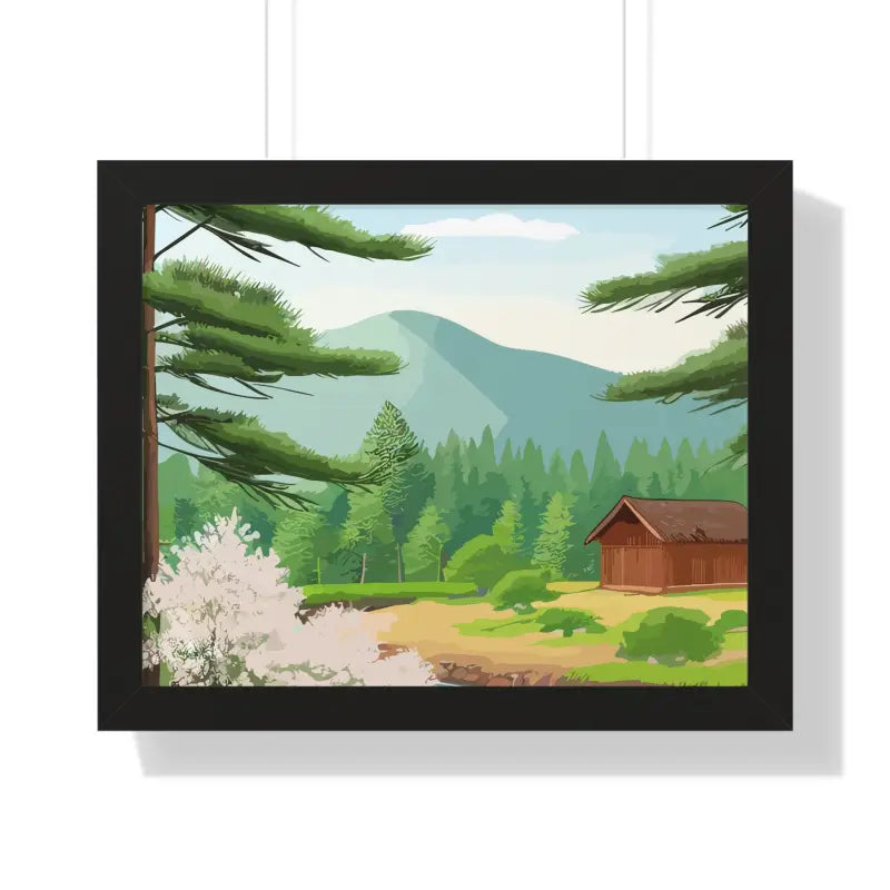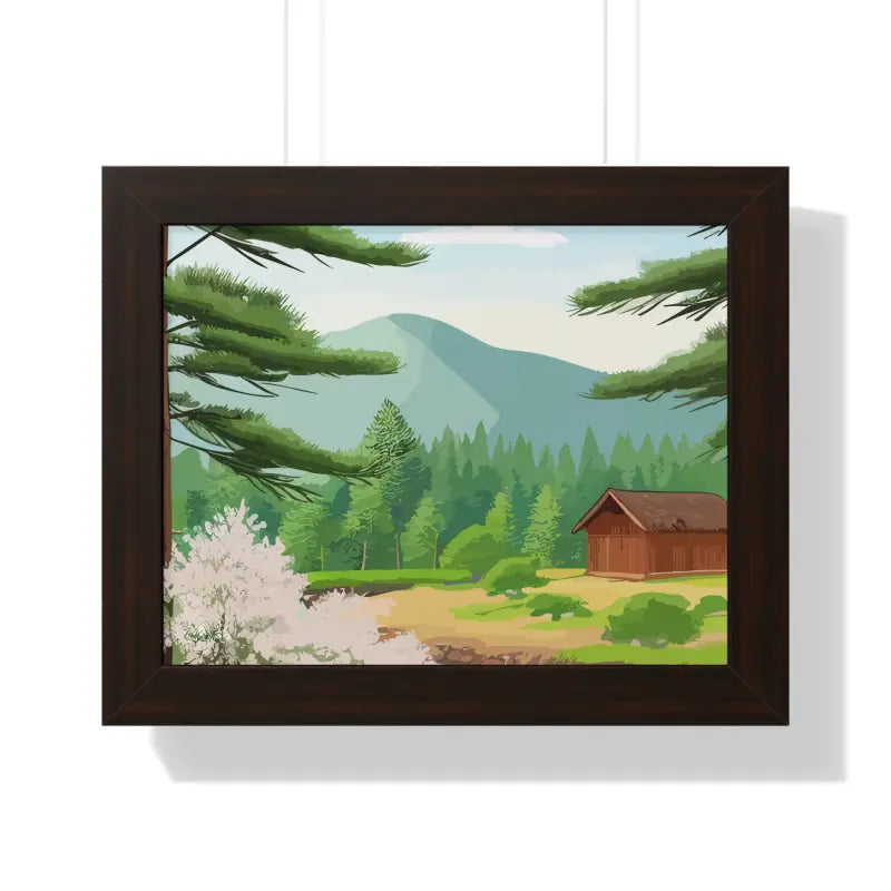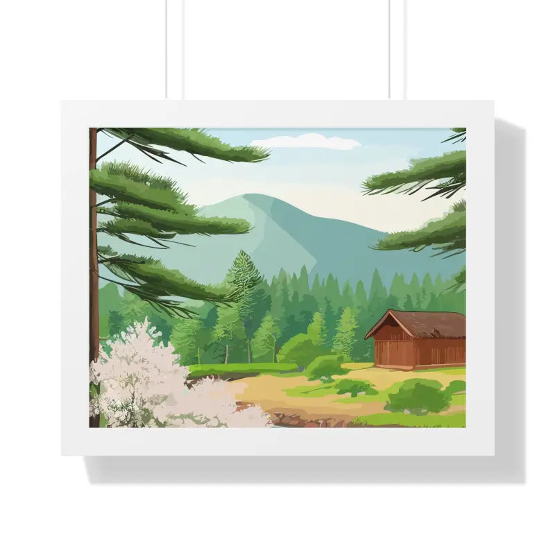 A cabin in the woods with a stream flowing near the mountains in summer, Framed Horizontal Poster