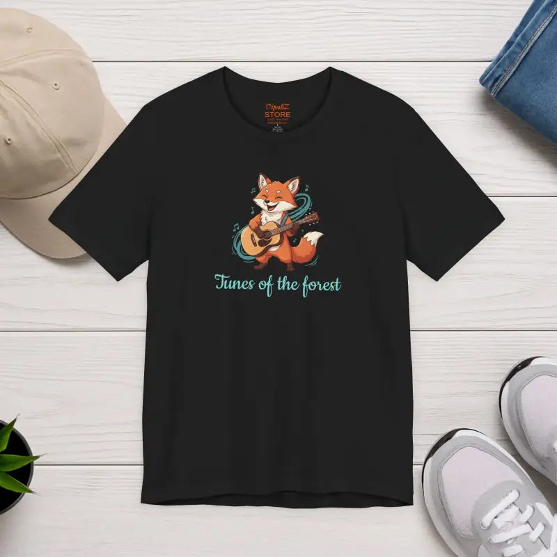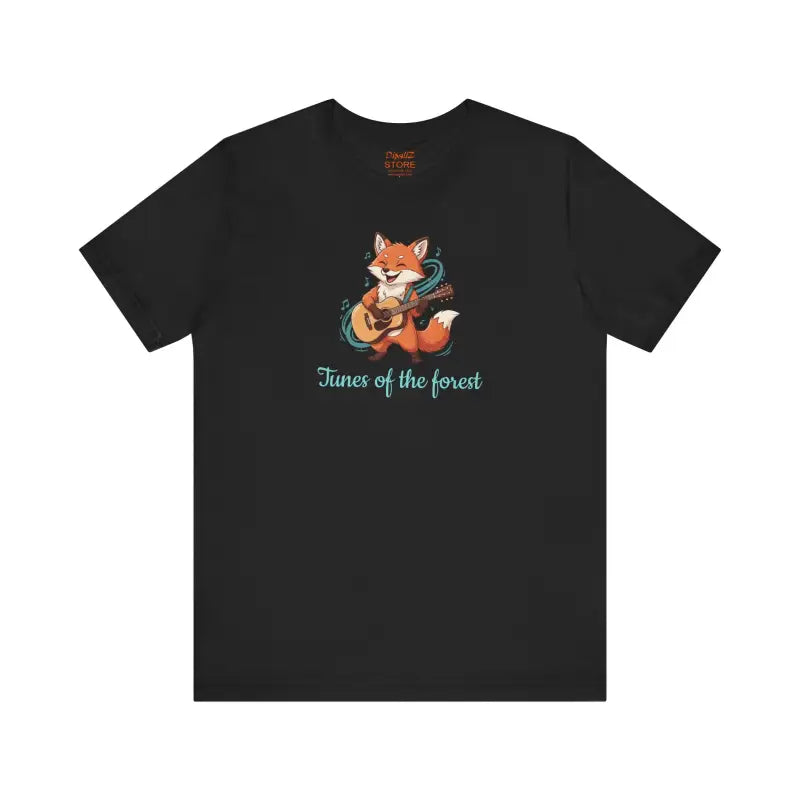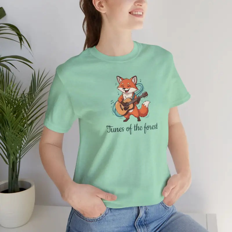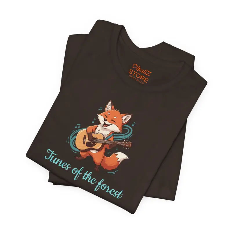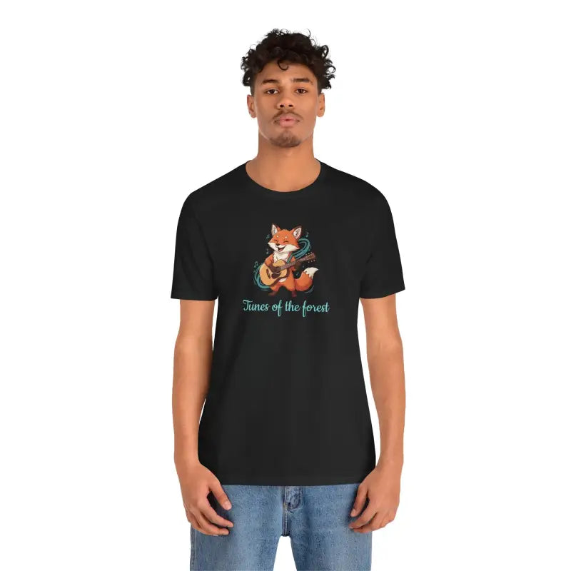 A fox with a guitar, Unisex Jersey Short Sleeve Tee. This classic unisex jersey short sleeve tee fits like a well-loved favorite. Soft cotton and quality print make users fall in love with it over and over again. These t-shirts have-ribbed knit collars to bolster shaping. The shoulders are tapered for a better fit over time. Dual side seams hold the garment's shape for longer.