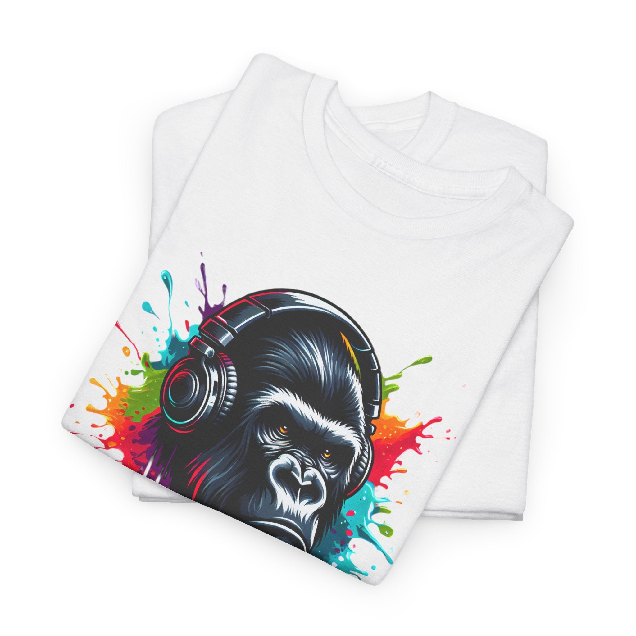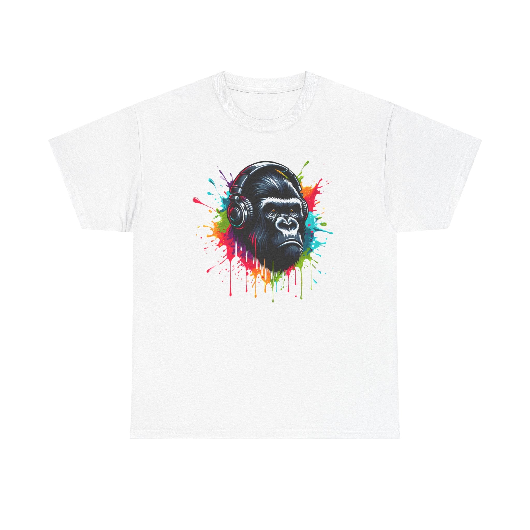 A Gorilla with a headphones with splashes of color, Unisex Heavy Cotton Tee. The unisex heavy cotton tee is the basic staple of any wardrobe. It is the foundation upon which casual fashion grows. The specially spun fibers provide a smooth surface for premium printing vividity and sharpness. No side seams mean there are no itchy interruptions under the arms. The shoulders have tape for improved durability.
