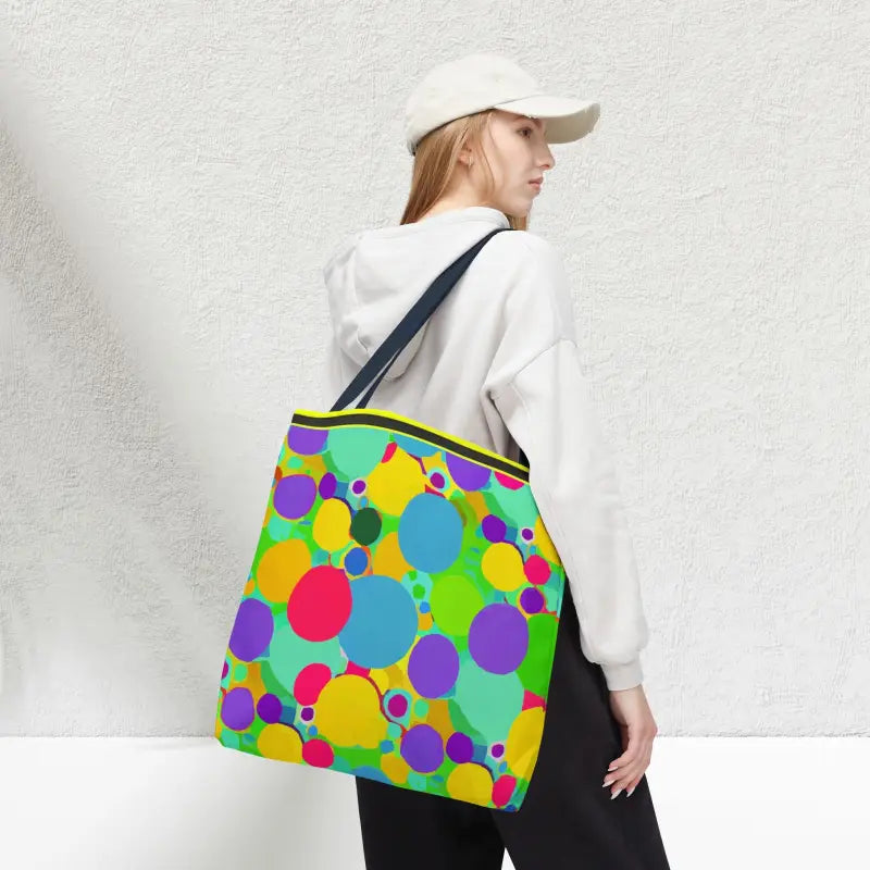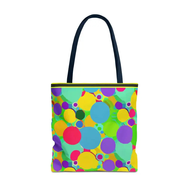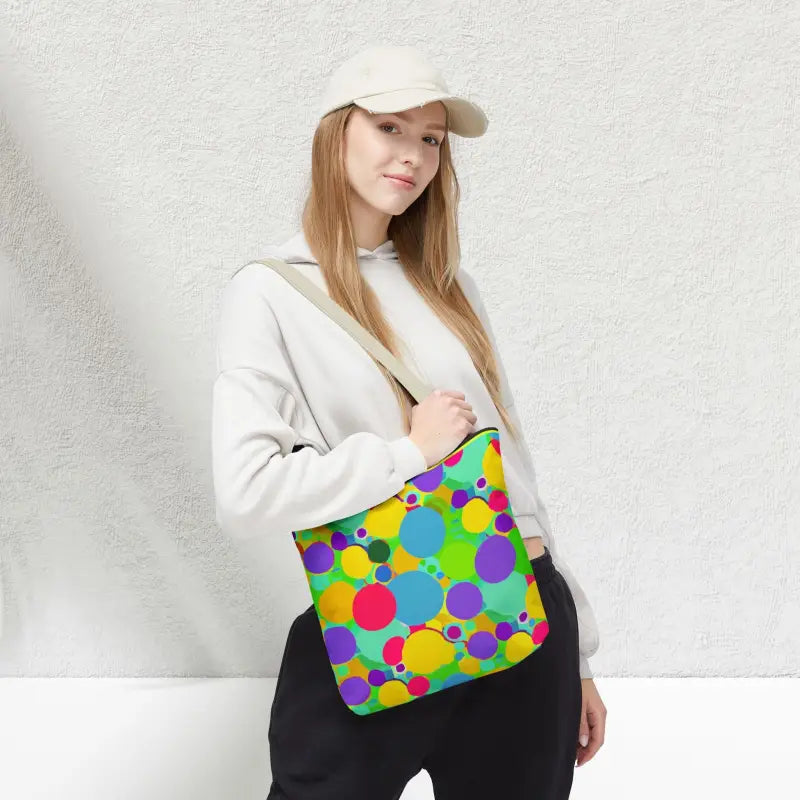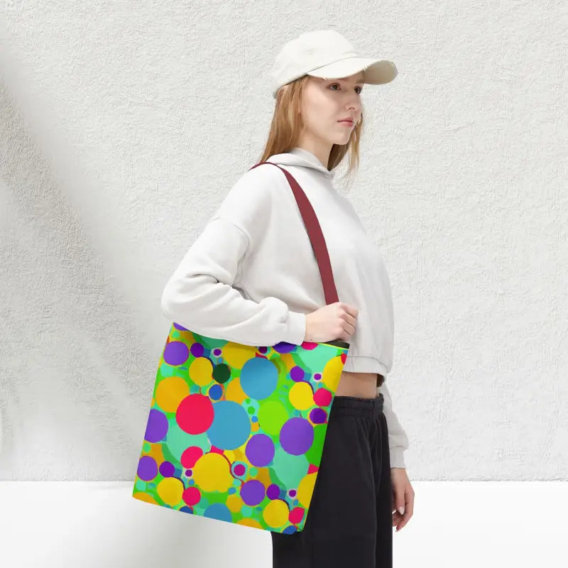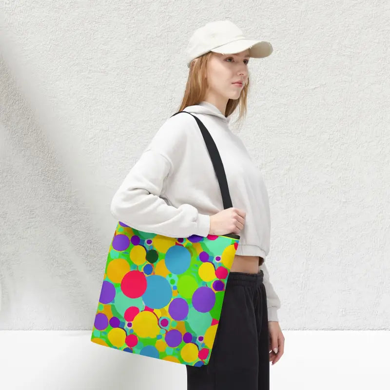 Colorful Circles Tote Bag. Colorful and stylish all-over print Tote Bag with abstract circles design. Perfect for expressing personal taste and adding flair to any outfit. Comfortable to carry, even when loaded with items. Relevant for fashion-conscious individuals looking for a practical yet fashionable accessory. Ideal for holidays, vacations, shopping trips, and everyday use.