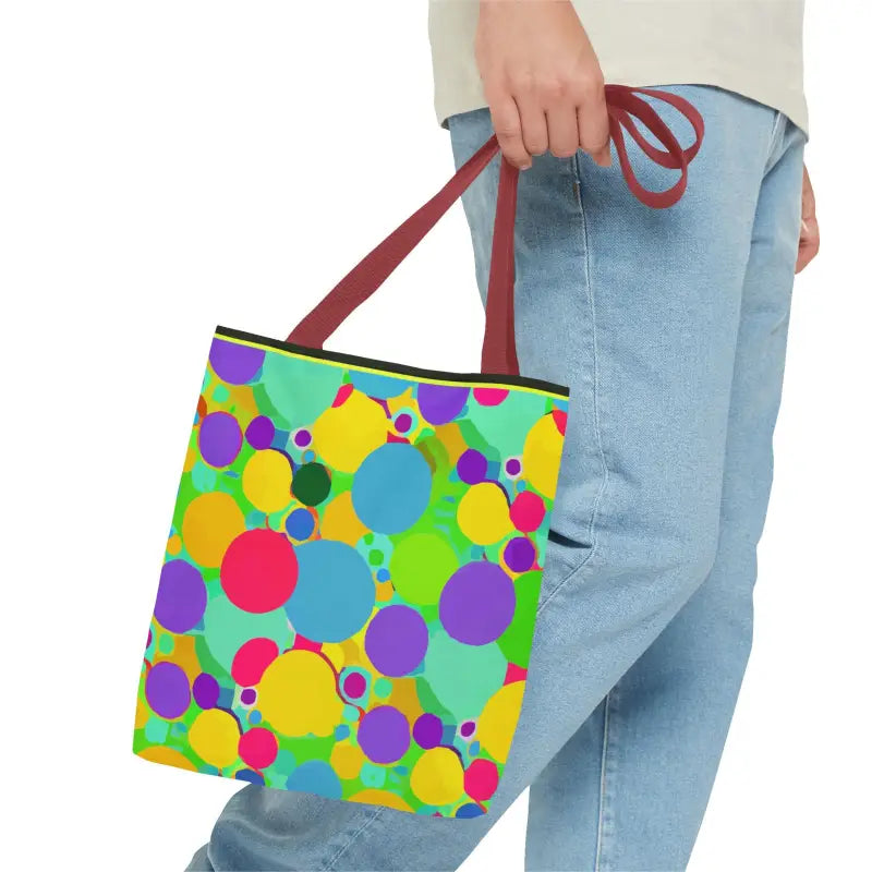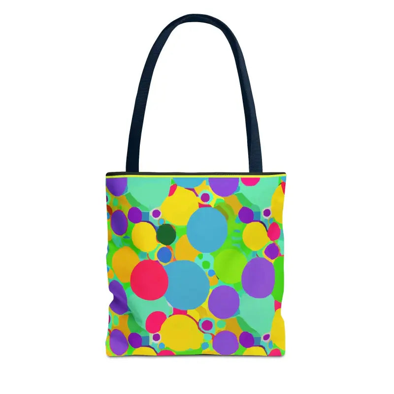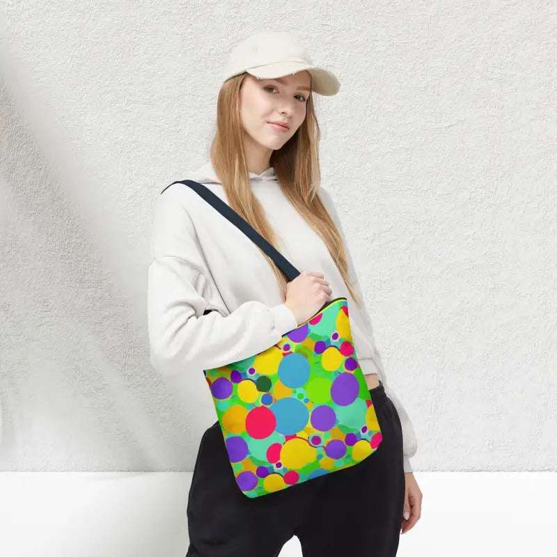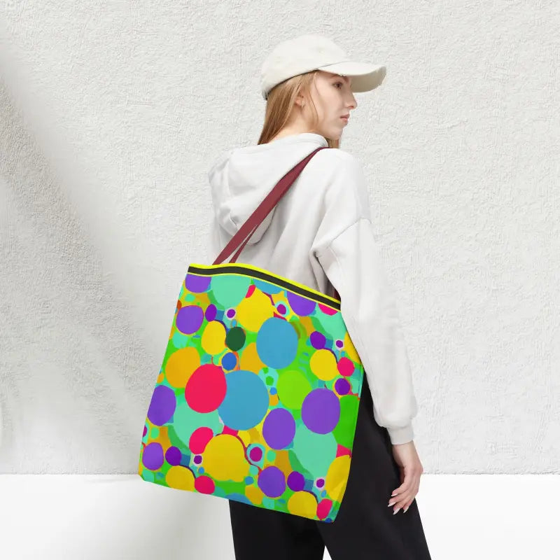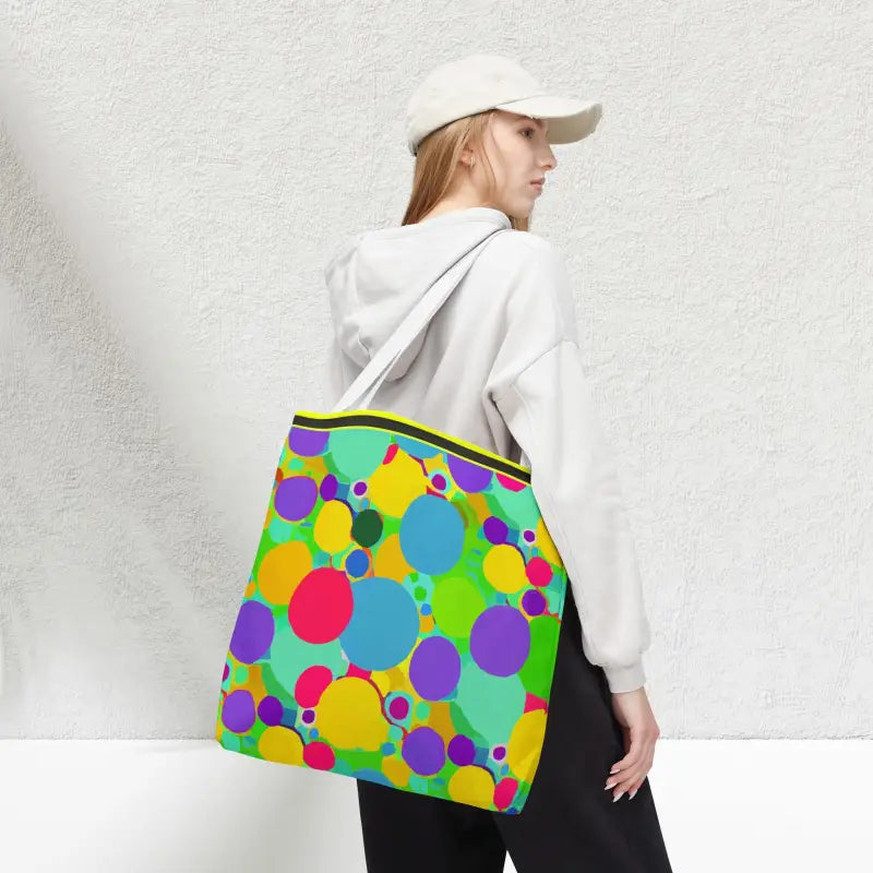 Colorful Circles Tote Bag. Colorful and stylish all-over print Tote Bag with abstract circles design. Perfect for expressing personal taste and adding flair to any outfit. Comfortable to carry, even when loaded with items. Relevant for fashion-conscious individuals looking for a practical yet fashionable accessory. Ideal for holidays, vacations, shopping trips, and everyday use.