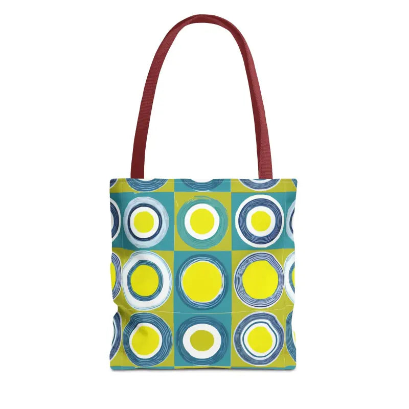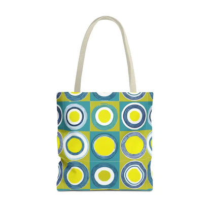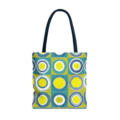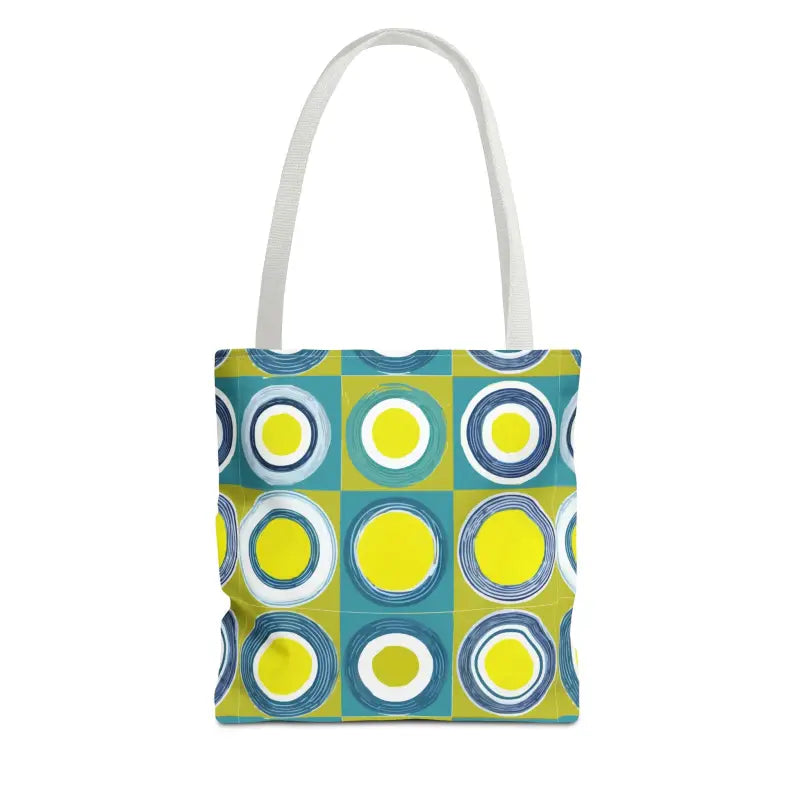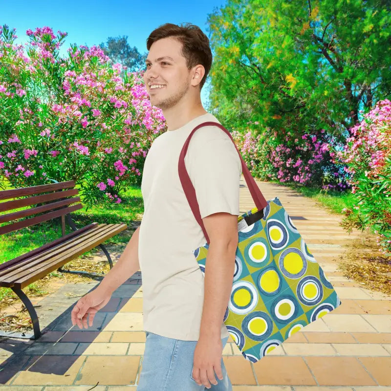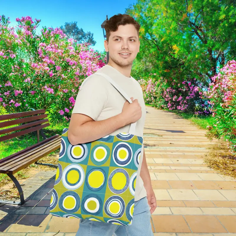 Abstract Green Circles All Over Print Tote Bag. This abstract green circles pattern all over print Tote Bag is the perfect accessory to add a touch of style and flair to your outfit. Made with durable 100% polyester, it offers a comfortable carrying experience even when filled with items. Ideal for those who love unique and trendy accessories, this Tote Bag is perfect for everyday use and can be a great addition to your wardrobe. Perfect for gifting on birthdays, holidays, and special occasions.