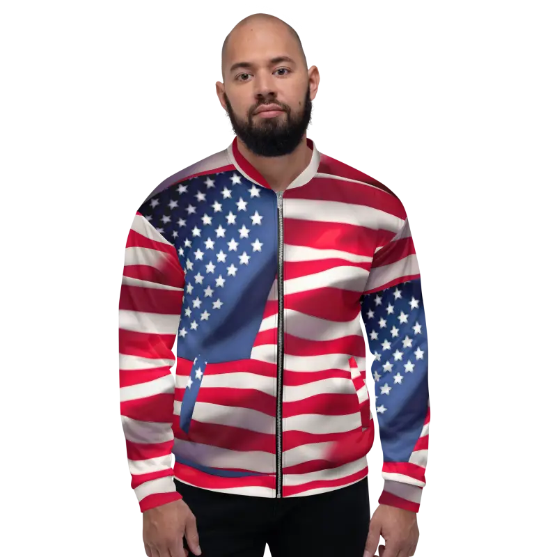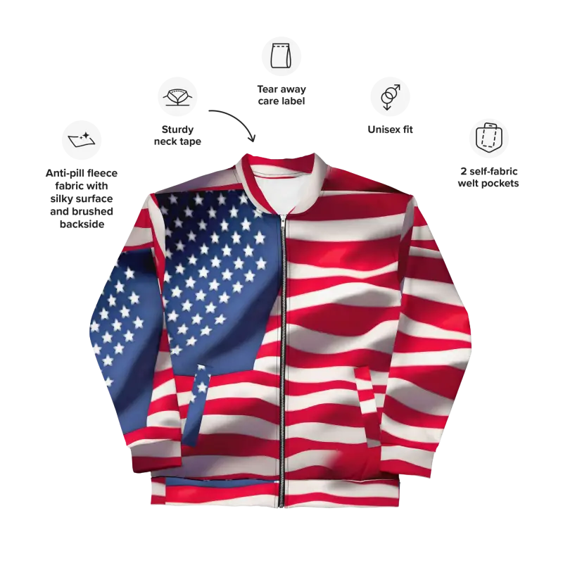 Ready to unleash instant rockstar energy and turn every sidewalk into your runway? This iconic unisex bomber jacket brings serious style, elevating any outfit while letting you show off your patriotism with unmatched confidence.
