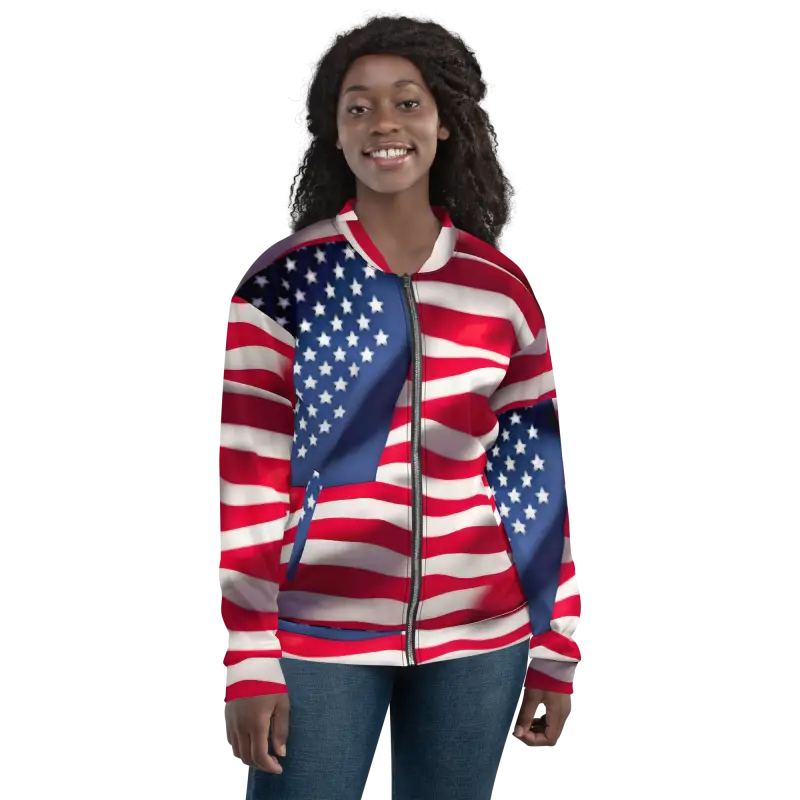 Transform your look, amplify any outfit, and radiate vibrant patriotism wherever you go. Grab this unisex bomber jacket today and let every moment showcase your passion for bold American flag vibes. Make your move—stand out, feel powerful, and take your style up a notch!