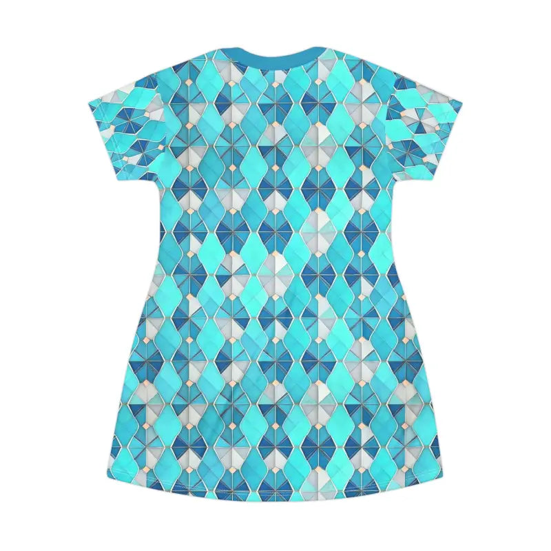 The aqua blue geometric design isn’t just visually appealing; it tells a story of modernity and dynamic creativity. Each angle and curve of the pattern brings out an exuberant energy that turns an ordinary day into a haute runway. It’s a bold expression of personal style, wrapped up in an easy-to-wear form.