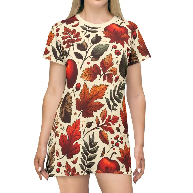 The design features an exquisite tapestry of autumn's finest display. Leaves in varying stages of amber, crimson, and gold create an artwork that celebrates the wonder of fall. This striking pattern makes this tee dress a standout piece in any wardrobe.