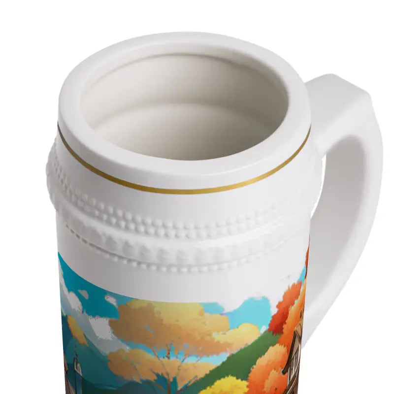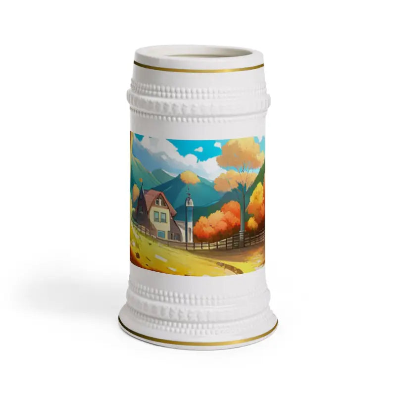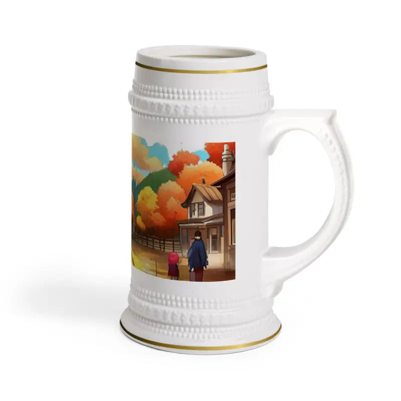 Bring the magic of the autumn landscape right to your hands. This beer stein mug is your invitation to embrace the cozy moments of fall, whether you’re warming up indoors, relaxing fireside, or hosting friends at a festive gathering. The detailed autumn landscape view wrapped around this 22 oz white ceramic beer stein mug captures the brilliance and warmth of the season, making each drink feel like an escape to a peaceful fall retreat.