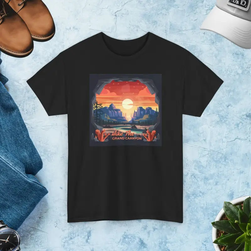 You will not want to take off this soft and cozy unisex Beautiful landscape, Hike the Grand canyon, Unisex Heavy Cotton Tee. The unisex heavy cotton tee is the basic staple of any wardrobe. It is the foundation upon which casual fashion grows. The specially spun fibers provide a smooth surface for premium printing vividity and sharpness. No side seams mean there are no itchy interruptions under the arms. The shoulders have tape for improved durability.