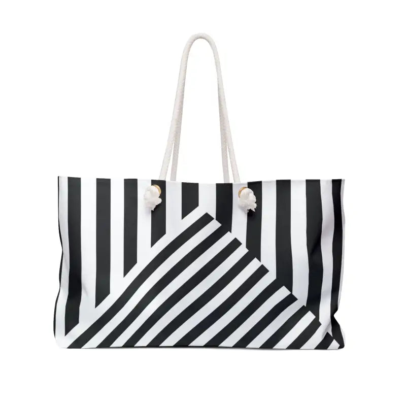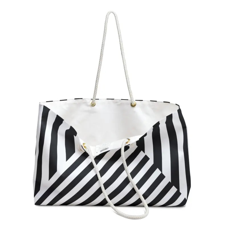 Dive into a spontaneous getaway with this black and white striped pattern weekender bag that carries your dreams as easily as your sunscreen and novel. Picture yourself strolling along a sunlit pier, the polyester weekender bag brushing against your hand, whispering tales of new adventures.