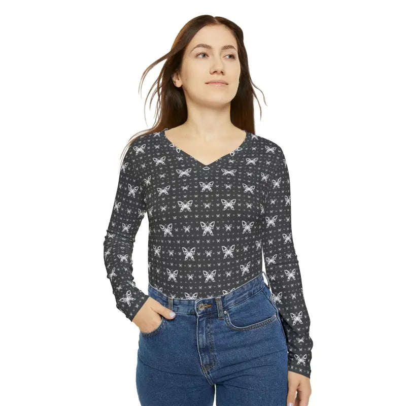 Unleash your inner trendsetter with the ultimate long sleeve, sleeve v neck tee that blends irresistible comfort and a standout butterflies pattern for womenâs fashion that turns heads and sparks conversations!