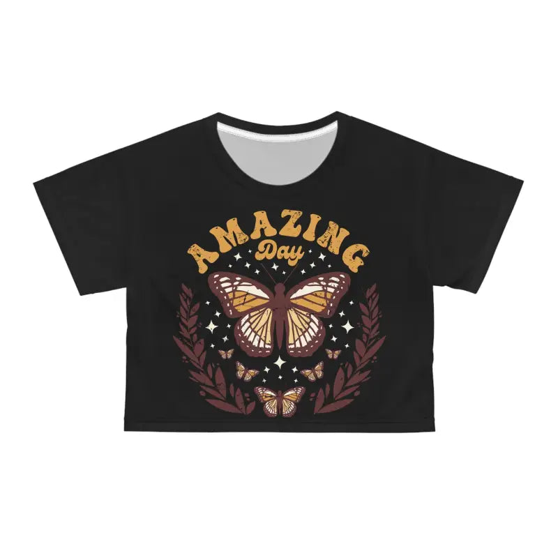Unleash your vibrant spirit and embrace every new day with an explosion of positivity wearing the Butterflies Amazing Day AOP Crop Tee. Designed for those who live life with joy and spontaneity, this women's polyester tee delivers not just on style, but on comfort and durability too. Stitched with meticulous care, it's the ideal blend of chic fashion and effortless grace, meant to reinvigorate your daily look and spread good vibes wherever you go.