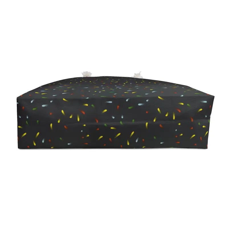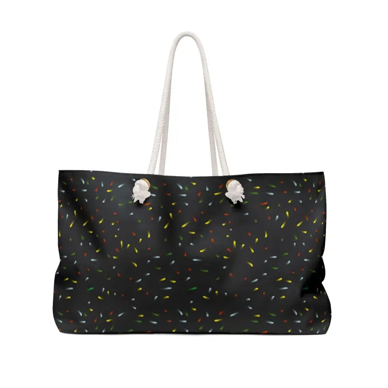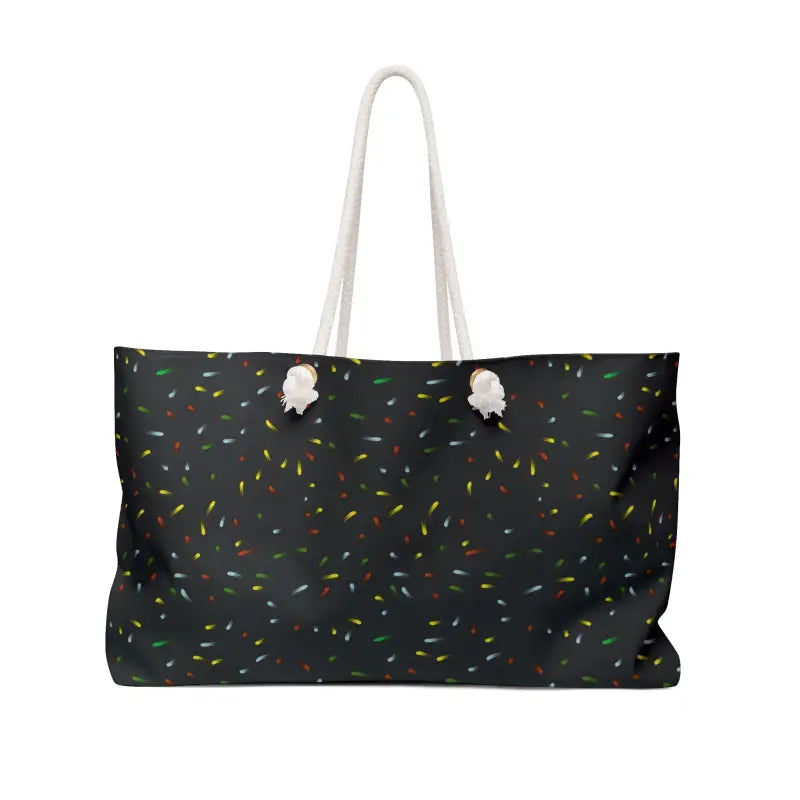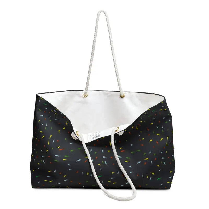 A kaleidoscope of confetti dances across the oversized polyester canvas, framing every adventure in high-energy style. Whether you’re jogging to the farmer’s market or catching a flight to Ibiza, this confetti weekender bag is your new go-anywhere companion for modern lifestyle essentials.