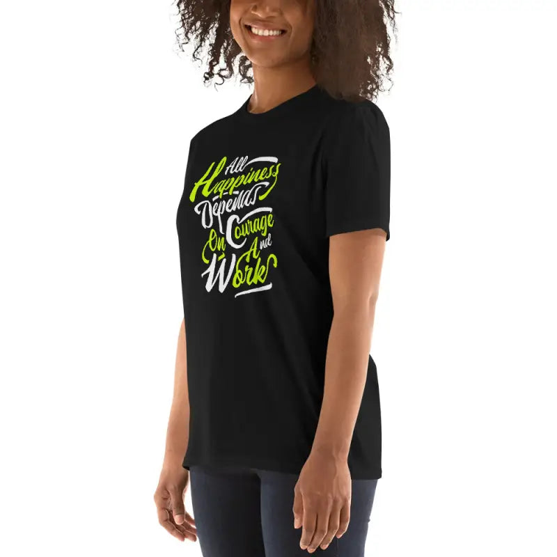 Whether you're gearing up for a challenging workout session, working late nights to meet deadlines, or tackling a weekend DIY project, this tee has got your back. It carries the spirit of the sayin' that "all happiness depends on courage and work," propelling you to embrace the power of perseverance with every step you take. Designed not just to endure but to thrive in various scenarios, this t-shirt is as versatile as it is stylish. Wear it over jeans for a casual outing or pair it with your favorite shorts at the gym; this reliable staple lets your dedication speak volumes.