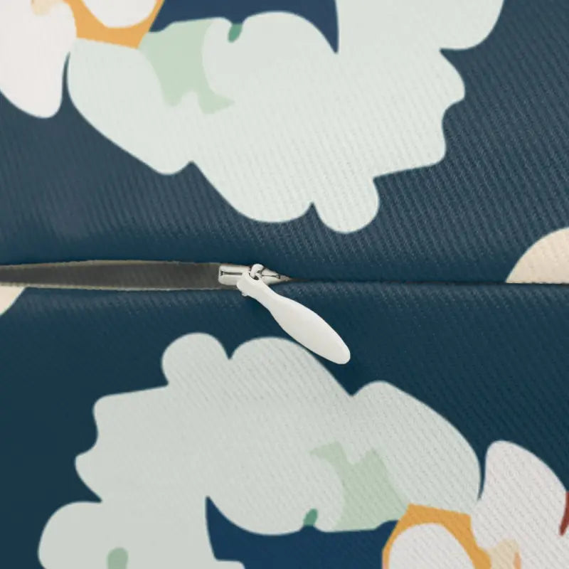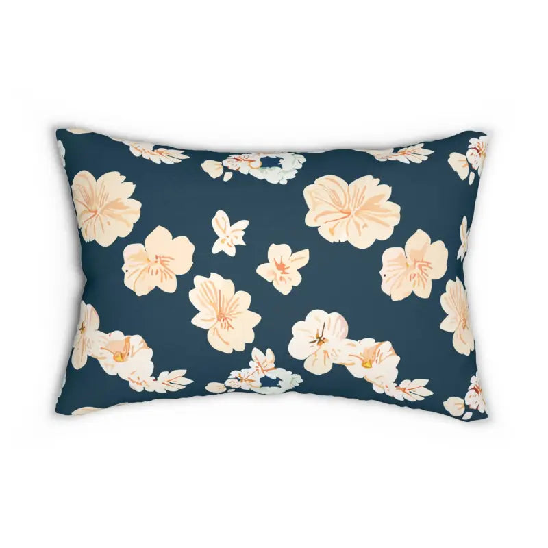 Cream colored flowers on dark blue, Spun Polyester Lumbar Pillow. Create a cozy and stylish home interior with DipaliZ spun-polyester lumbar pillow! It's perfect for adding a pop of color to your living space while also being practical with its water-resistant fabric. Plus, it comes with a stuffing pillow included making it easy to use right away.