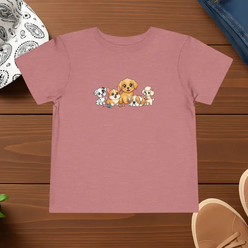 Cute Puppies, Toddler Short Sleeve Tee. Uplift any child's wardrobe with an awesome kid's t-shirt. The Bella Canvas short sleeve tee for toddlers is a 100% Airlume combed and ring-spun cotton with a tear-away label for extra comfort. Choose your favorite color out of a big variety, and make unique staples that toddlers will happily wear every day.