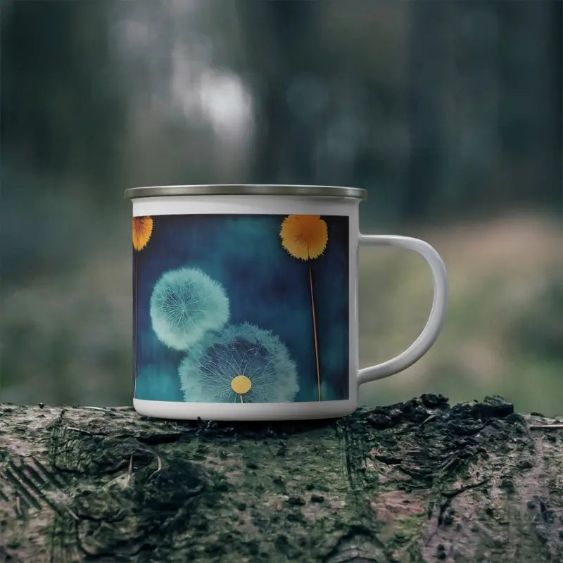 Print: Classic white enamel mug adorned with vibrant dandelions for a fresh, adventurous touch.