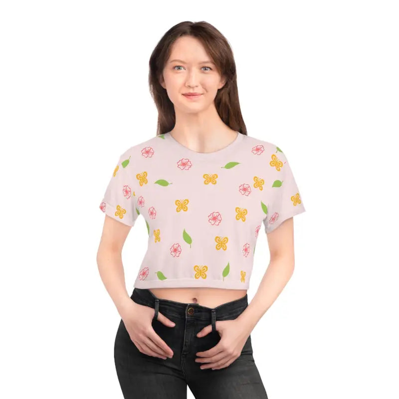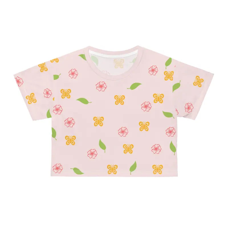 Dive into a world of vibrant whimsy with the Flowers and Butterflies AOP Crop Tee! This pink crop tee is your ticket to unleashing unparalleled style while keeping things chill and comfy. From its playful design to practical features, it's bound to become your go-to option for those laid-back days when you still want to look effortlessly fabulous.